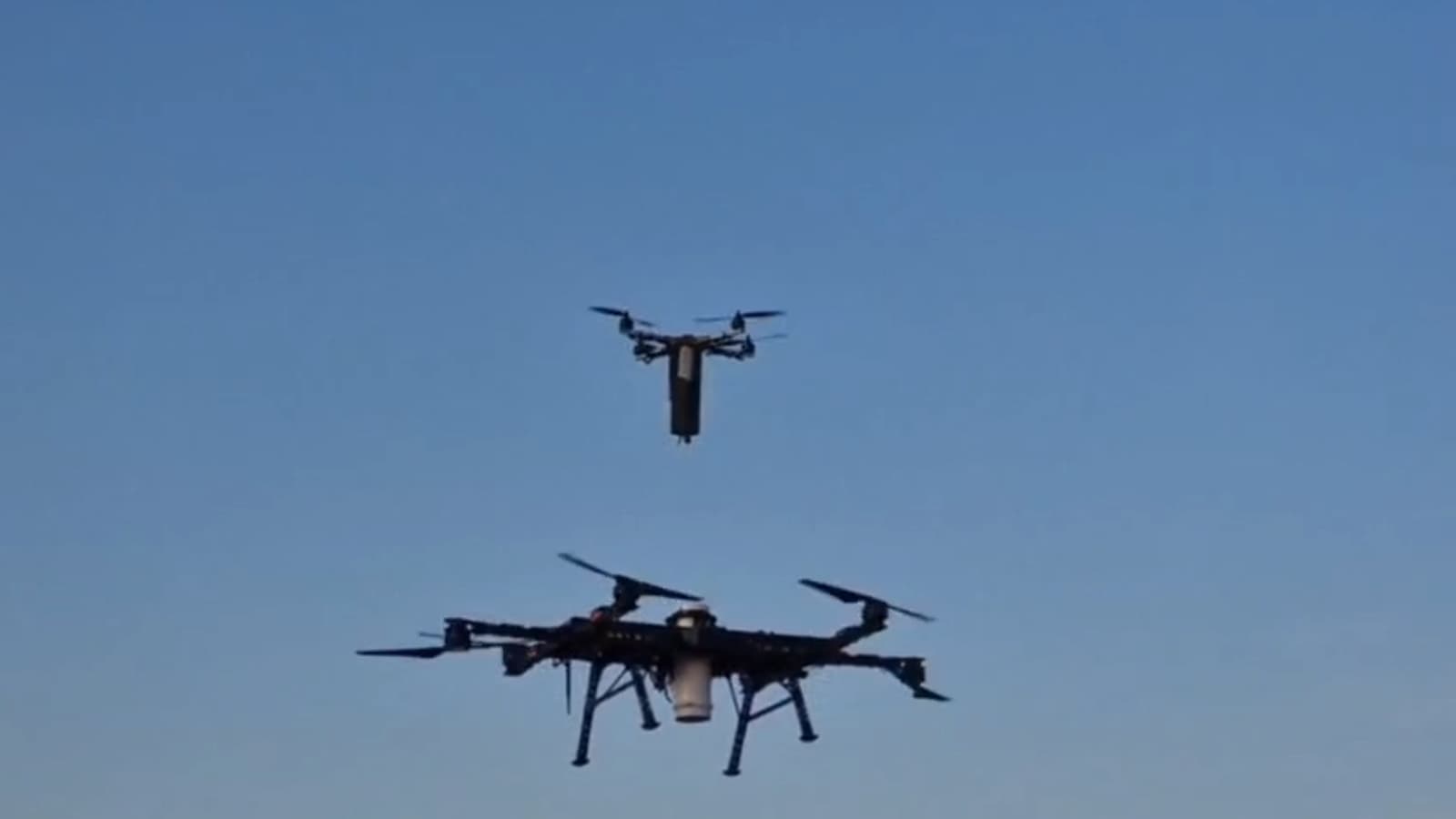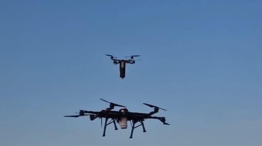 На опубликованных кадрах можно увидеть, как с коптера большого размера взлетает другой небольшой БПЛА. Производителем этих БПЛА является компания «Полдень. Двадцать первый век».