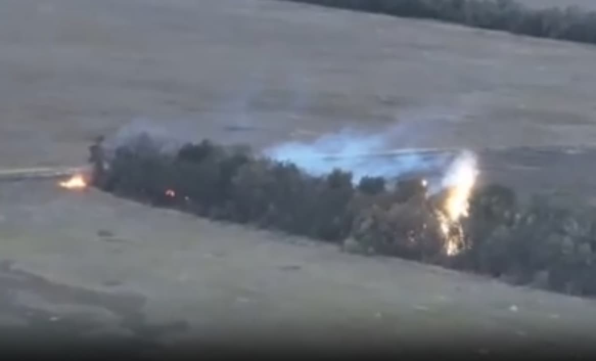 На появившихся снимках можно заметить, как дрон пролетает над посадкой, в которой засел противник. Беспилотник выпускает струи горючей жидкости, которая затем поджигается, вызывая детонацию боекомплекта.