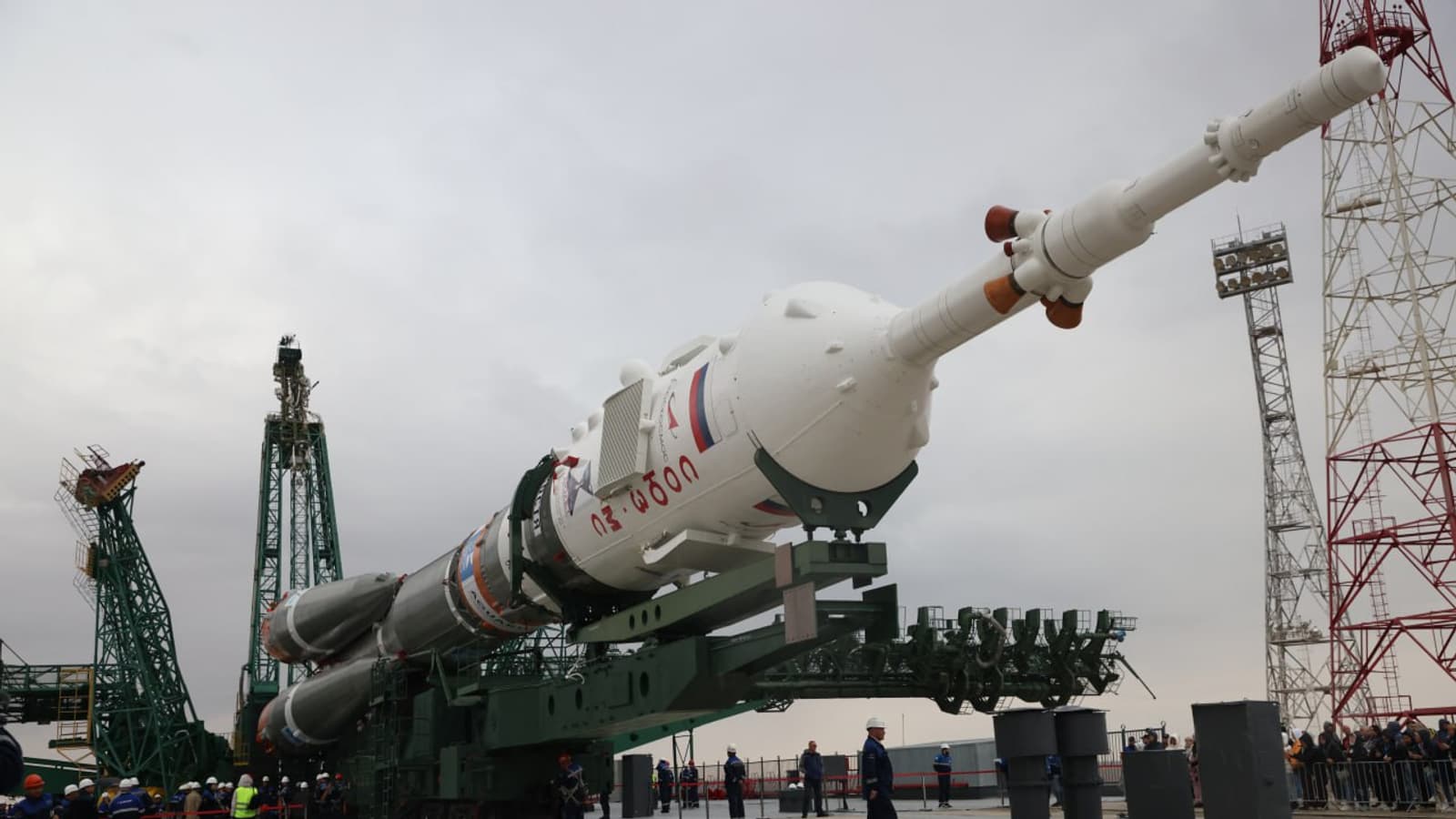 Ракета с пилотируемым кораблём благополучно установлена на стартовом комплексе Байконура. Её доставили утром по железной дороге.