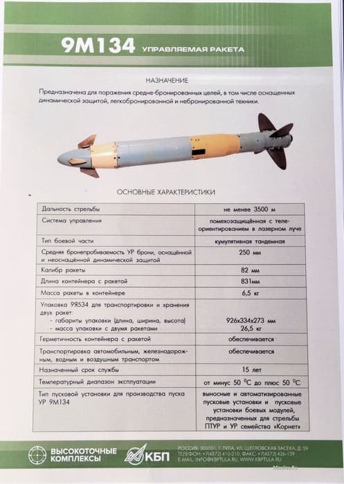Даманцев указал, что 9М134 обладает тандемной кумулятивной боевой частью, однако с бронепробиваемостью порядка 250 мм за динамической защитой вместо 1300 мм у «Корнета».