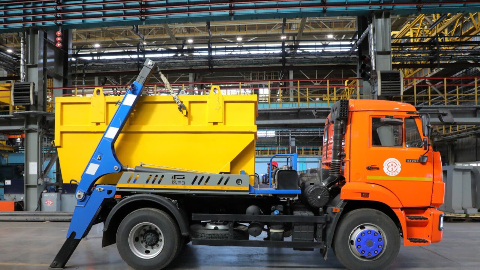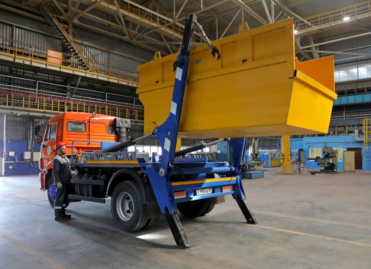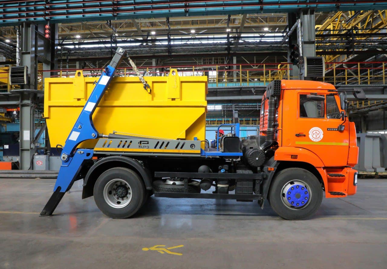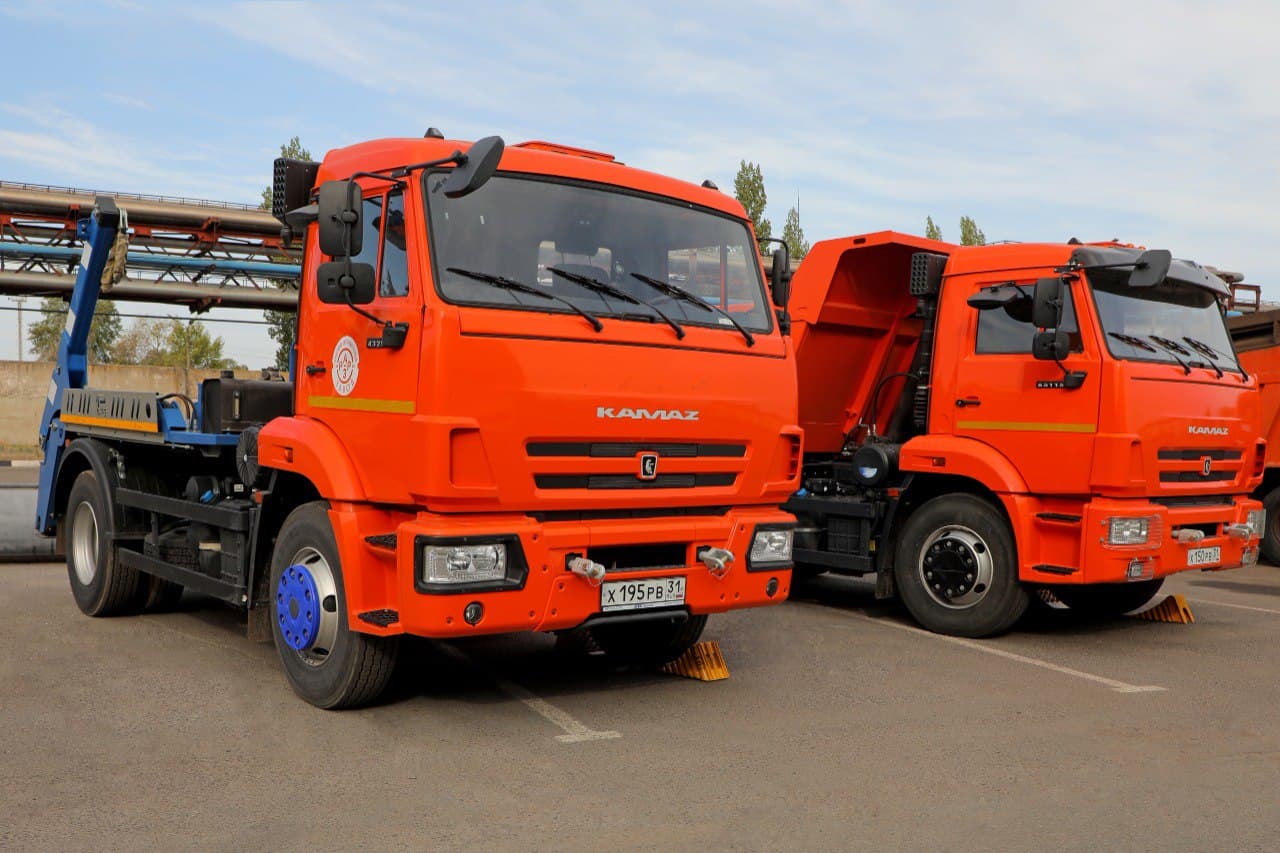 Новые КАМАЗы поступили в автотранспортный цех ОЭМК из Набережных Челнов. Автомобиль оборудован порталом и гидравлической системой, что позволяет водителю самостоятельно устанавливать, снимать и перемещать съёмный контейнер.