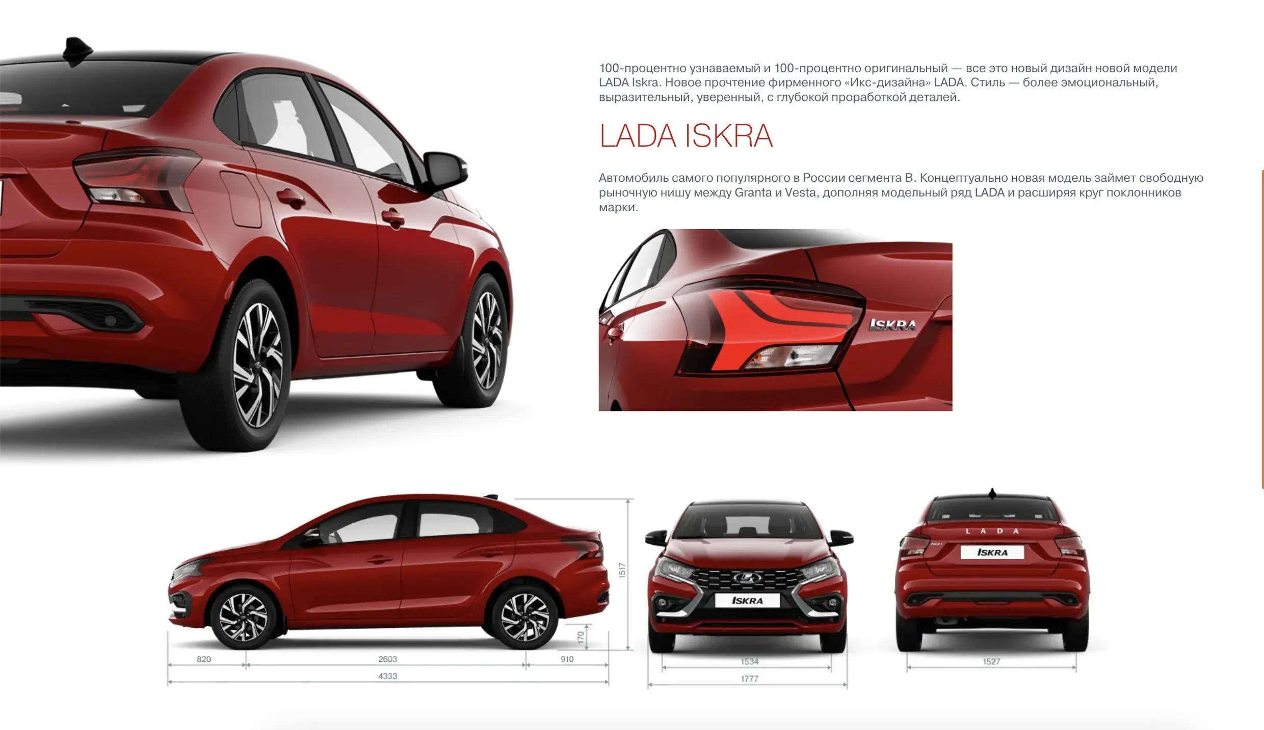 Пока нет полной брошюры с описанием комплектаций, расцветок и оснащения. В наличии только фотографии. Зато обнародованы точные габариты седана. Iskra гораздо просторнее Granta, а по размеру колесной базы Iskra практически догоняет Vesta.
