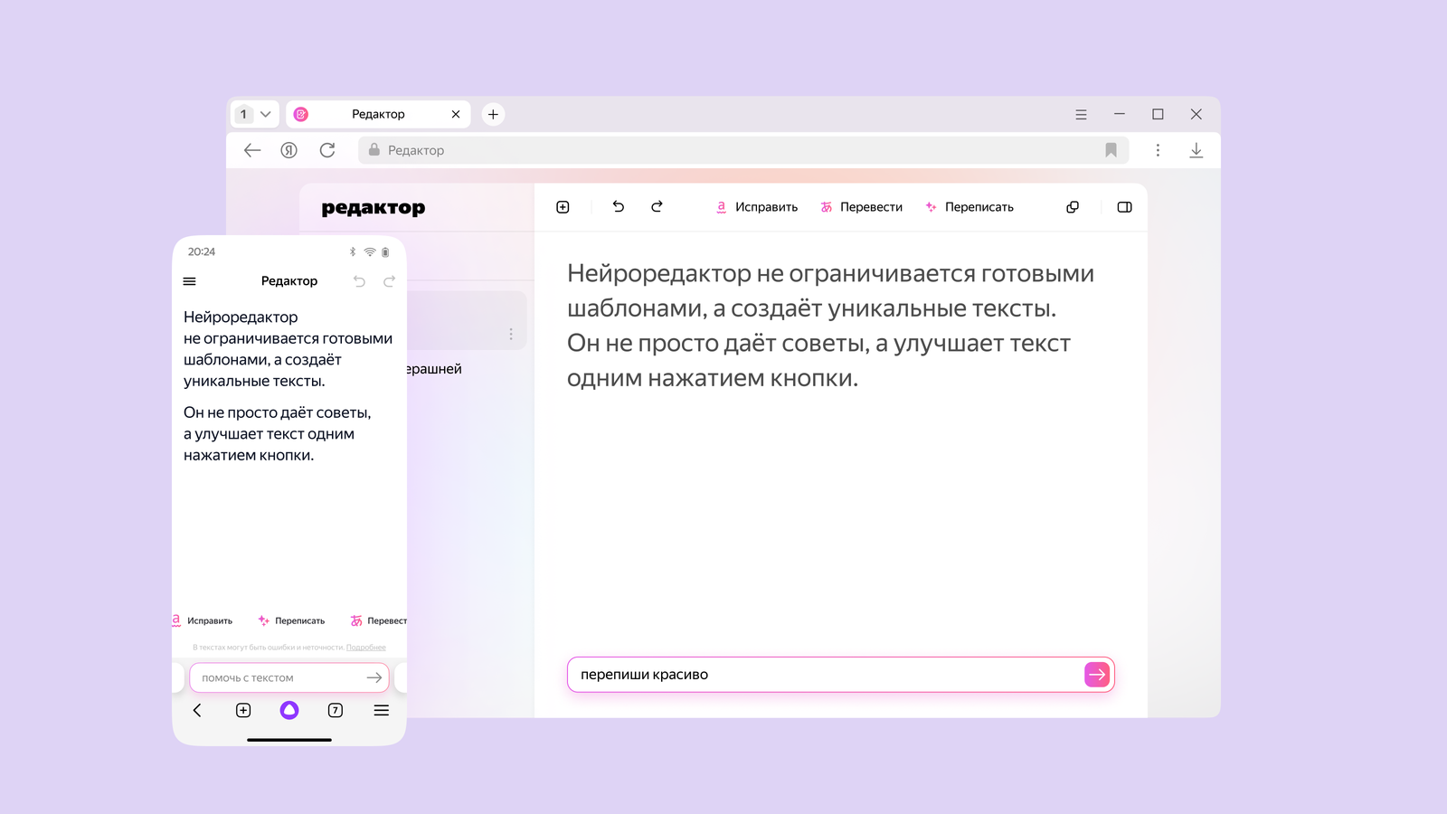Нейроредактор позволяет создавать тексты, менять их стиль и редактировать на русском и английском языках. Его можно открыть при нажатии кнопки «Редактировать» рядом с любым сайтом в «Яндекс Браузере».