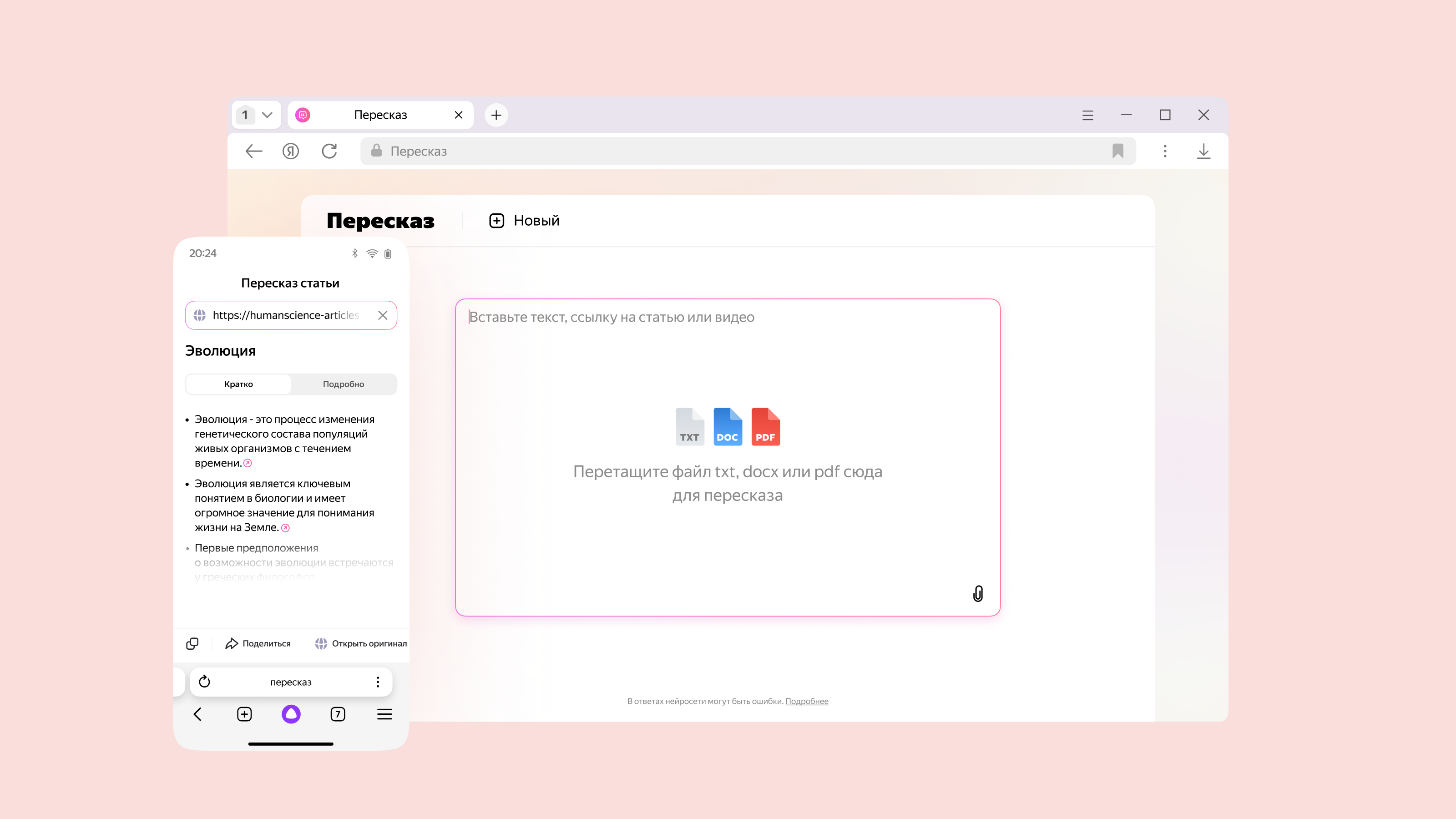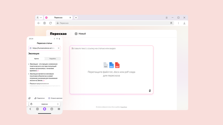 Для работы с текстами теперь появилась возможность краткого пересказа. На компьютерах функция доступна для разных форматов — PDF, DOCX, TXT.