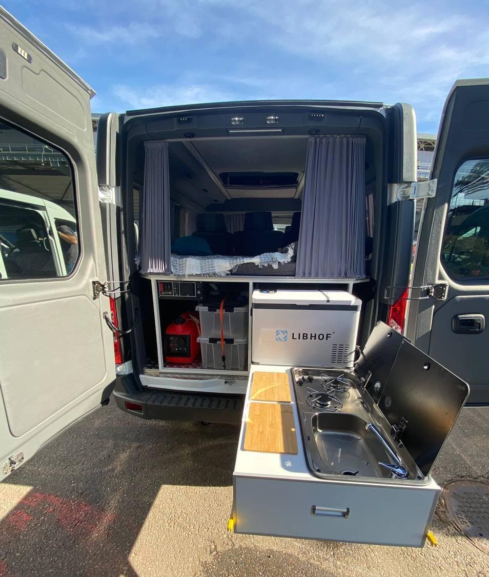В задней части дома на колёсах есть большая кровать. Между передними и задними креслами стоит столик. А над головой — окно в крыше. В выдвижном модуле в багажнике установили кухню c холодильником.