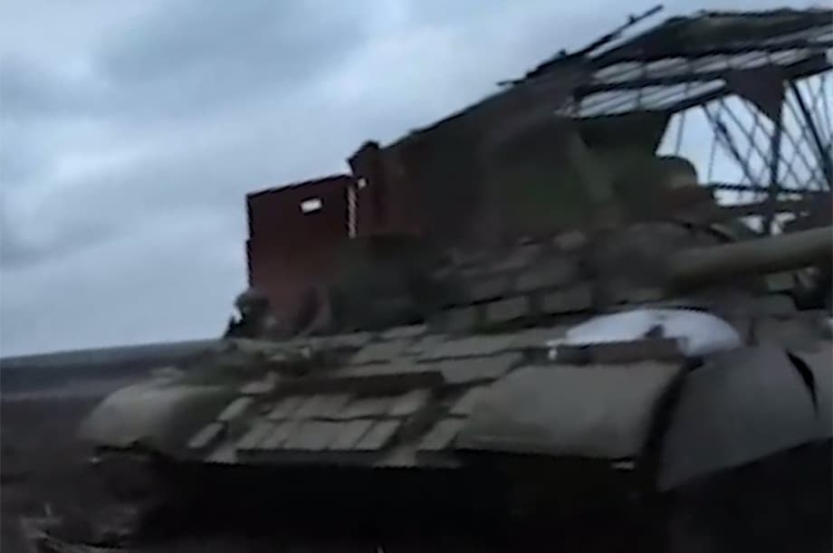 На шасси среднего танка Т-62 бойцы также выполнили тяжелый бронетранспортер. У бронетехники демонтировали поврежденную башню, а для защиты от дронов-камикадзе над корпусом водрузили «супермангал».