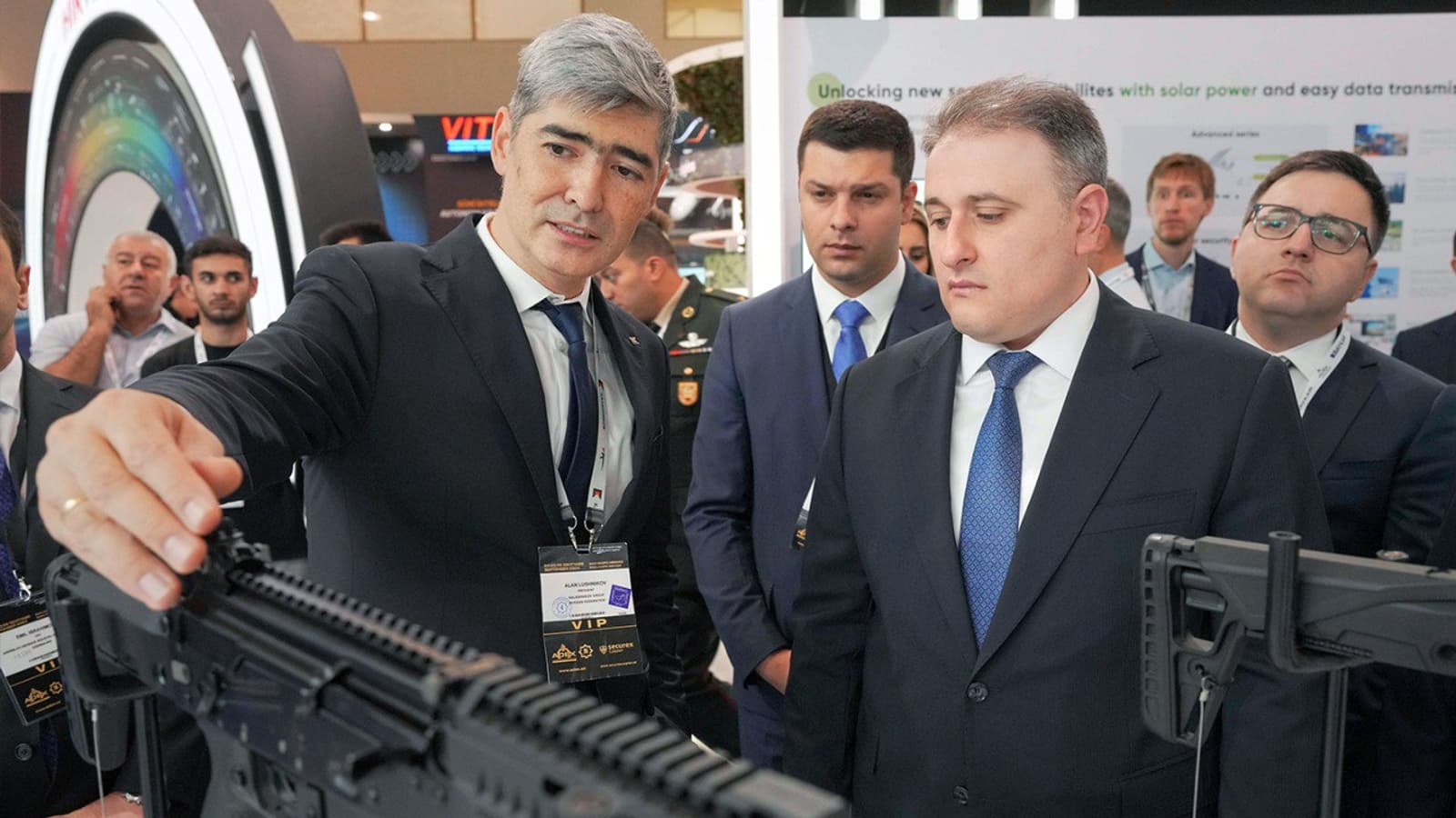 Президент «Калашникова» Алан Лушников показал лучшие образцы вооружений министру оборонной промышленности Азербайджана Вугару Валеху оглы Мустафаеву. В их числе были ручной пулемет с ленточным питанием РПЛ-20 калибра 5,45 мм, а также ударный дрон «КУБ-Э», беспилотник СКАТ 350 М.