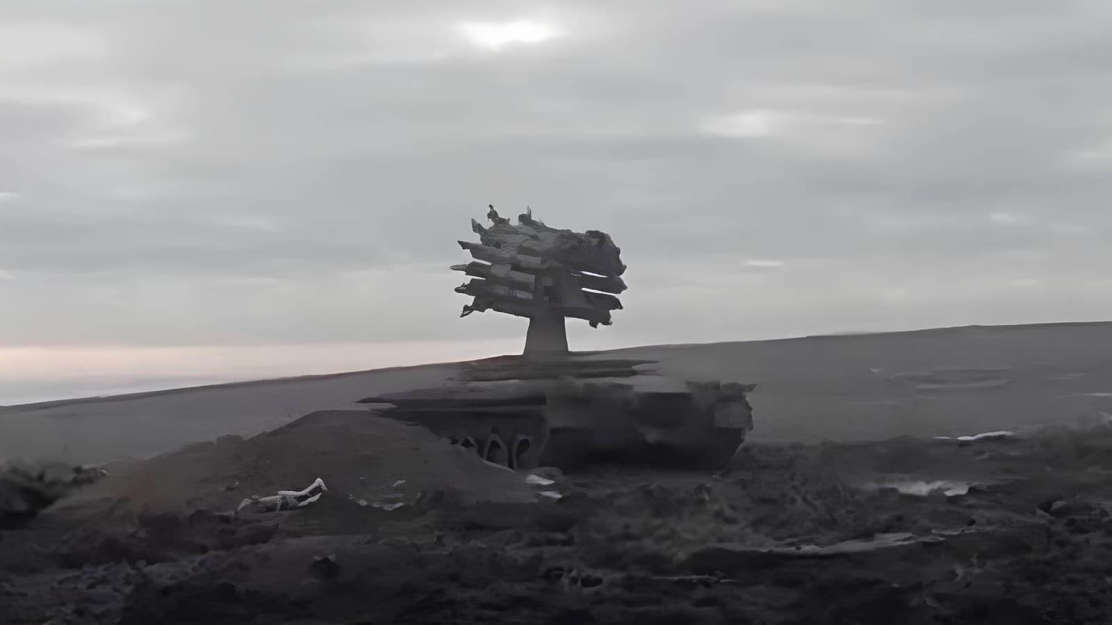 На передовой засветилась необычная реактивная установка. Она создана на базе танка Т-80 и бывшего 213-мм морского бомбомета РБУ-6000 «Смерч-2».