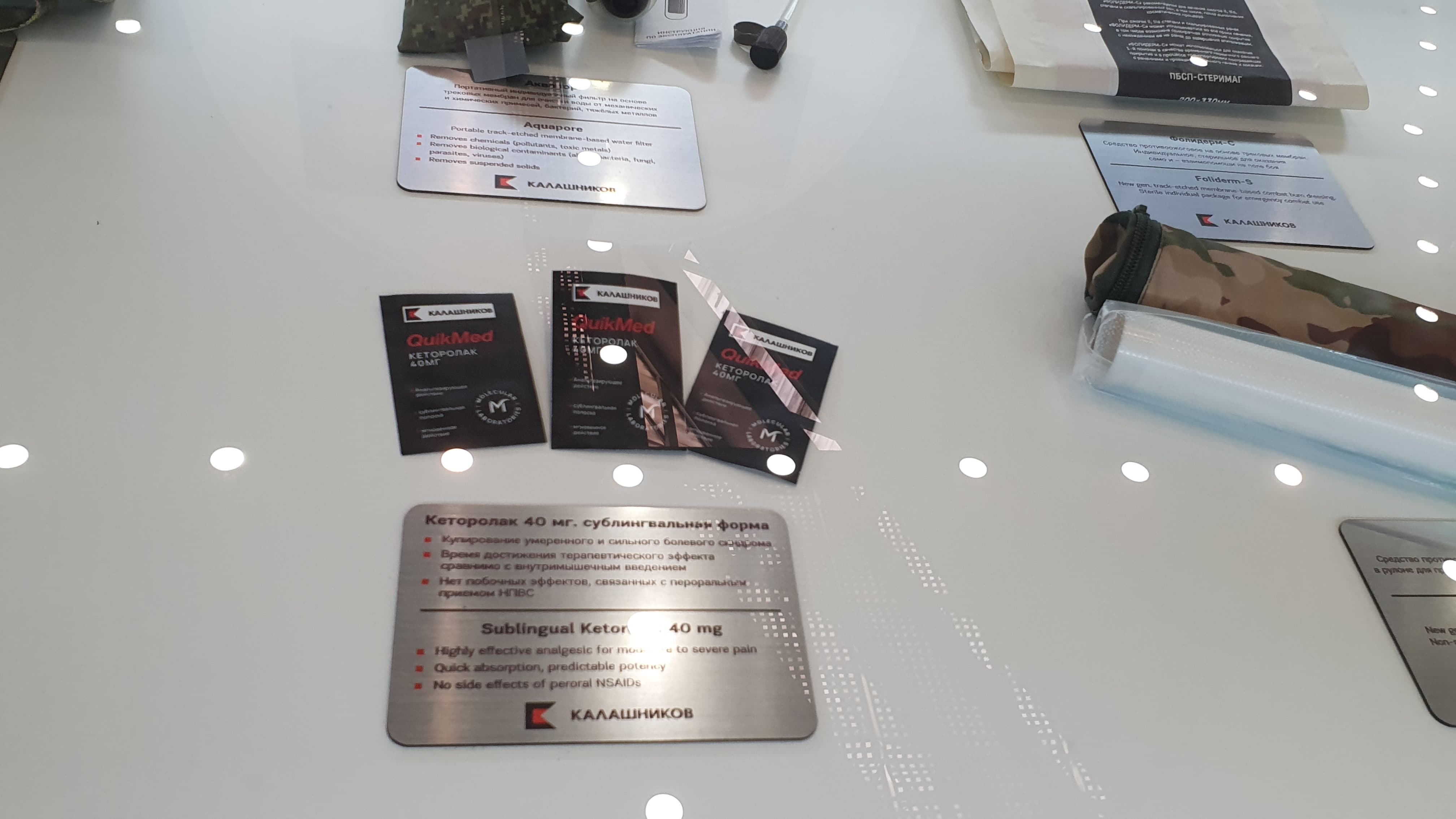 Например, это гемостатический бинт, сублингвальный анальгетик и противоожоговое средство на основе трековых мембран для оказания самопомощи и взаимопомощи на поле боя до попадания в госпиталь.