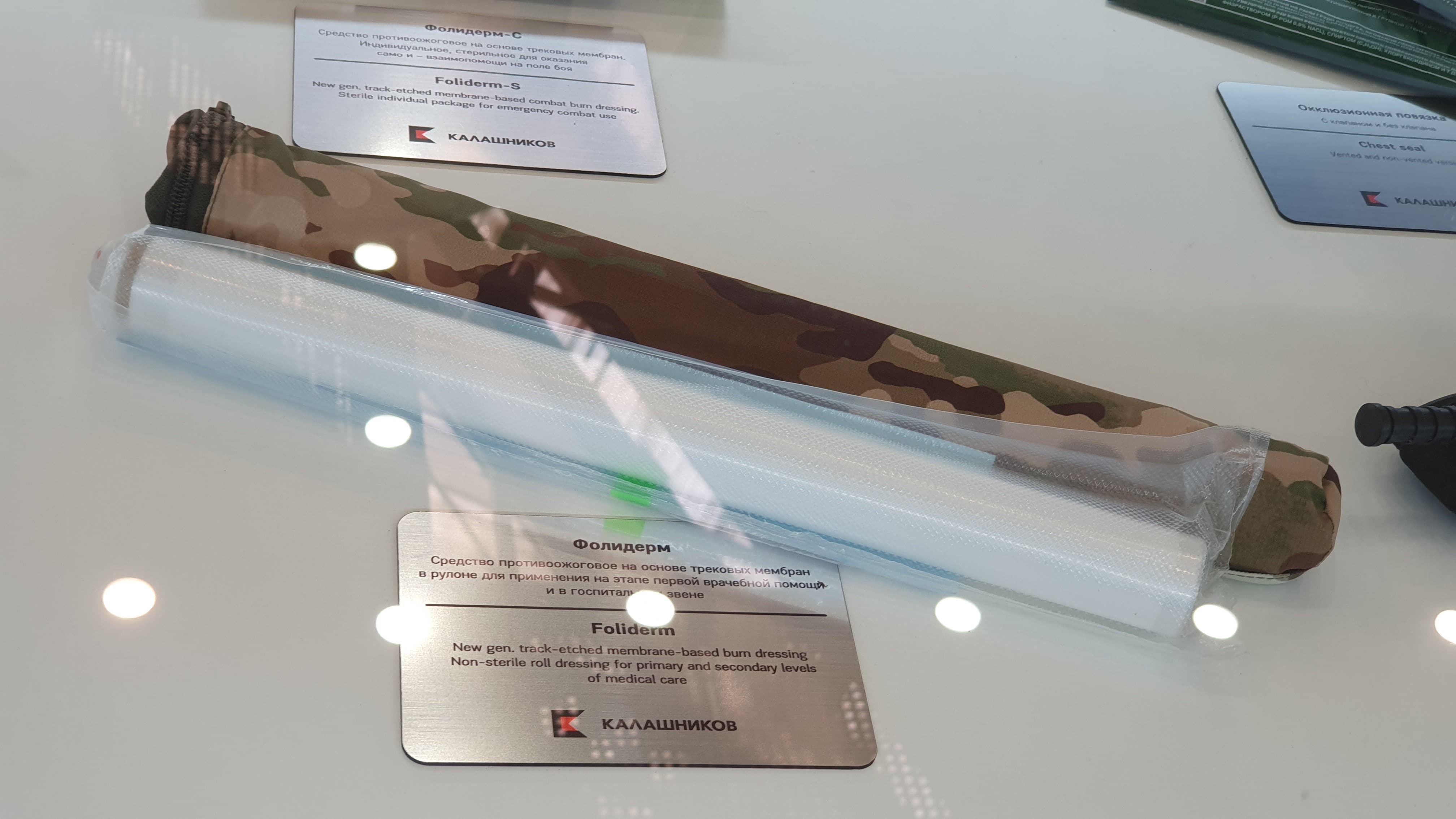 Фолидерм — ещё одна уникальная разработка «Калашникова», это противоожоговое средство на основе трековых мембран для оказания самопомощи и взаимопомощи до попадания в госпиталь. У него на подходе новое поколение, которое заменит в аптечке «Легионер» действующие гидрогелевые салфетки с лидокаином в 2025 году. Фолидерм-С представляет собой влагонепроницаемое и газонепроницаемое раневое покрытие размером 32 на 30 см, которое пригодится и для лечения ожогов, и как первичная повязка при ранениях.
