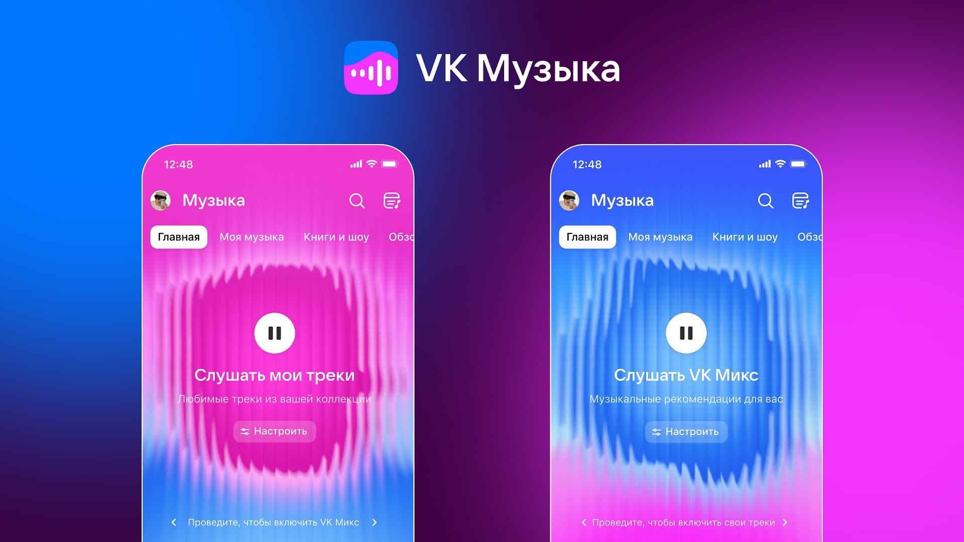 На главном экране сервиса представлены два основных раздела: «VK Микс» с рекомендациями и «Мои треки» — коллекция треков пользователя. В разделе «VK Микс» появились новые настройки, а плеер обновили.