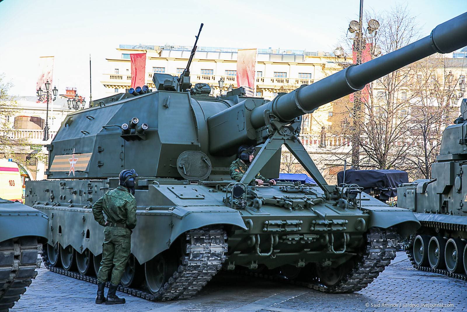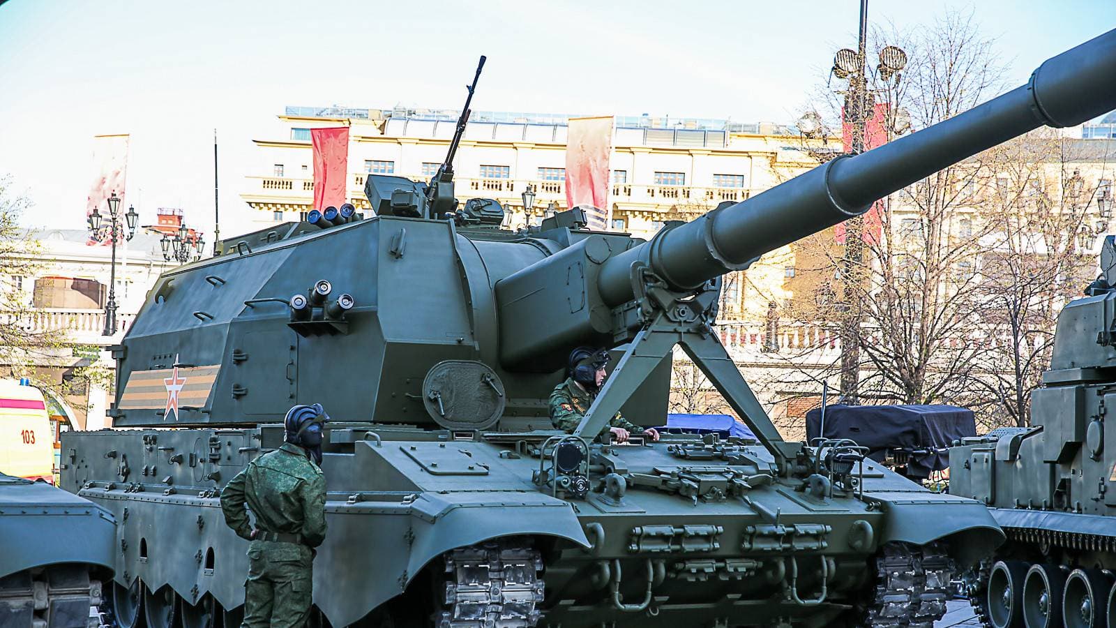 В распоряжении ВС России есть новейшая САУ «Коалиция-СВ» с пушкой 2А88 калибра 152-мм. Самоходная гаубица базируется на платформе танка Т-90 и предназначена для поражения всей номенклатуры наземных целей противника на расстоянии до 70 км.