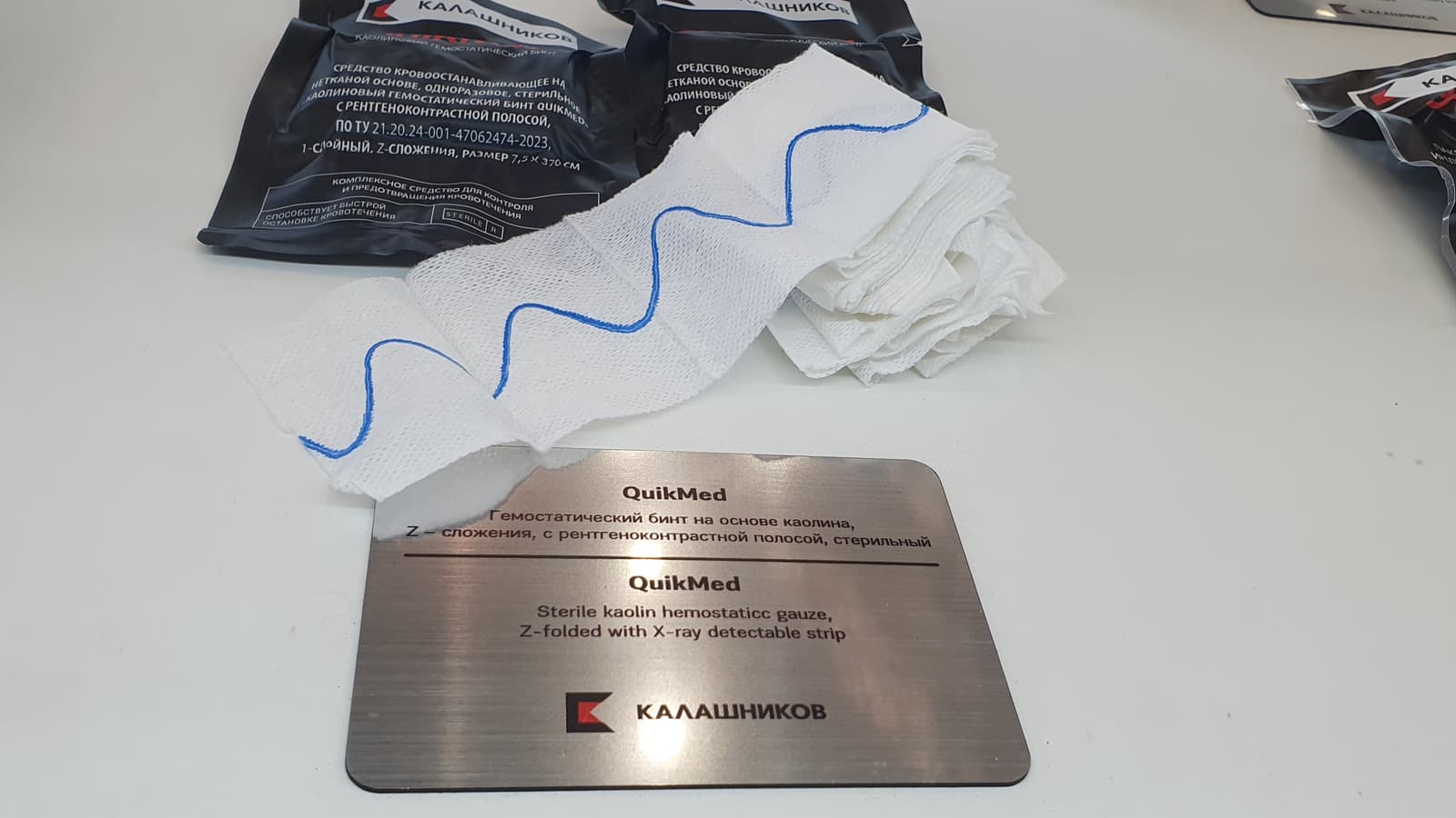 Стерильный гемостатический бинт с рентгеноконтрастной полосой третьего поколения на основе каолина — собственная разработка «Калашникова» для индивидуальной аптечки первой помощи (АППИ) «Легионер». Аптечка войдёт в состав разрабатываемой боевой экипировки третьего поколения «Легионер», и уже активно тестируется военнослужащими.