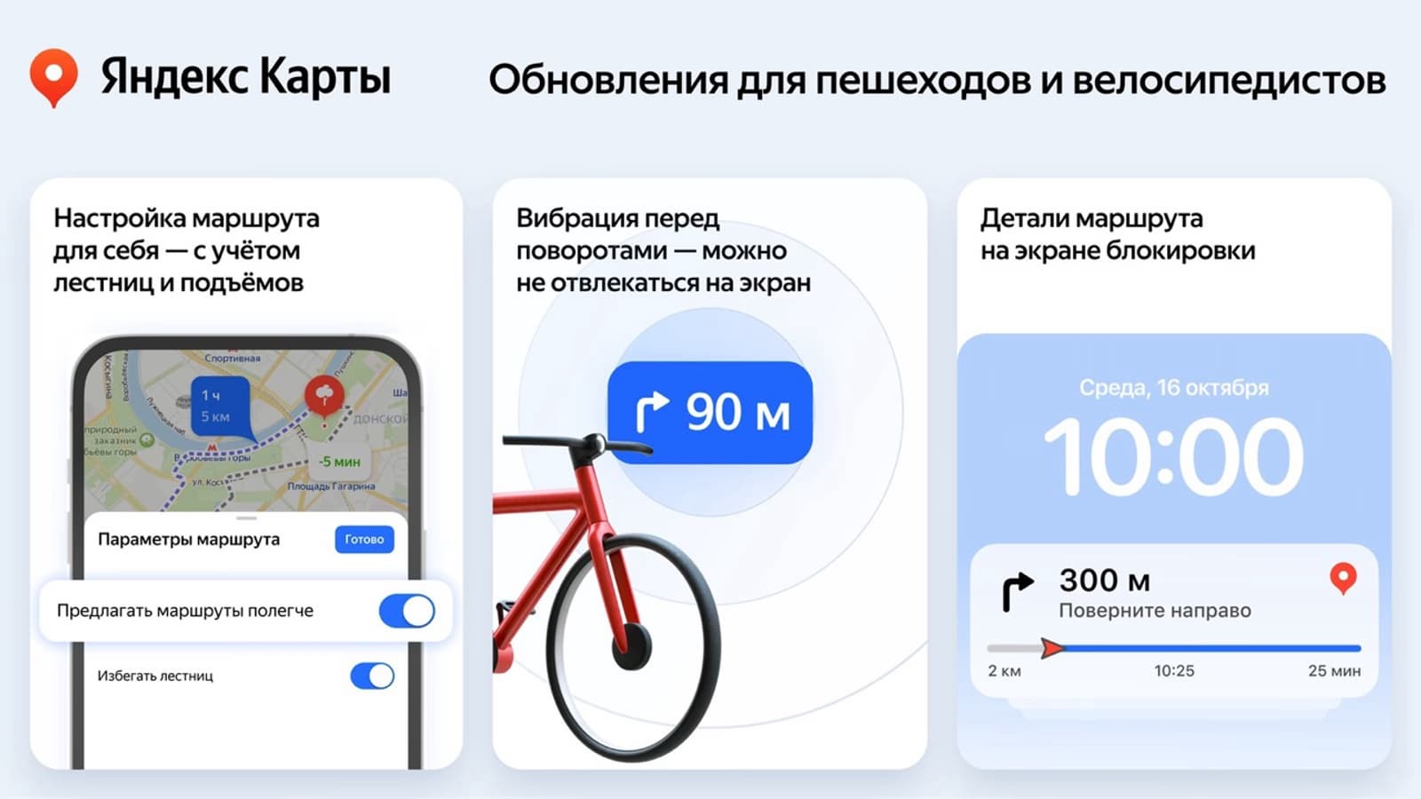 Кроме того, следить за маршрутом стало удобнее: пользователи могут видеть детали маршрута даже на заблокированном экране в режиме Live Activity для iOS или через виджет для Android. При приближении к повороту телефон будет вибрировать, что добавляет удобства в использовании навигации.