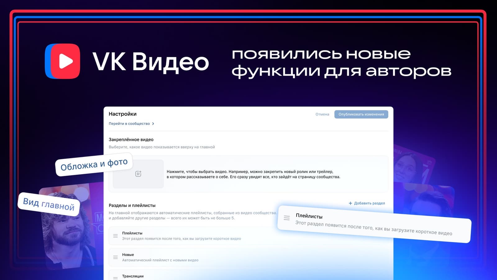 Команда «VK Видео» предоставила пользователям платформы новые функции. Теперь авторы могут создать уникальный дизайн обложки для своей страницы с видео, закрепить в топе ролик, а в новом разделе «Главное» — показать зрителям самый важный контент.