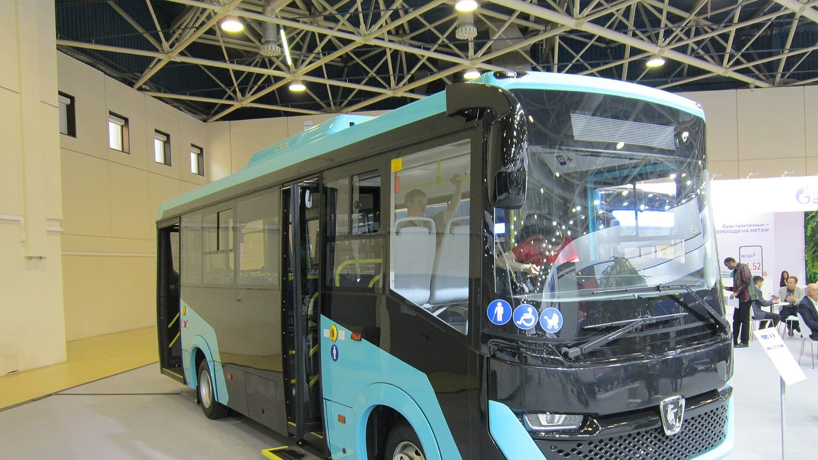 В автобусе 19 посадочных мест, а общая пассажировместимость — 65 человек.