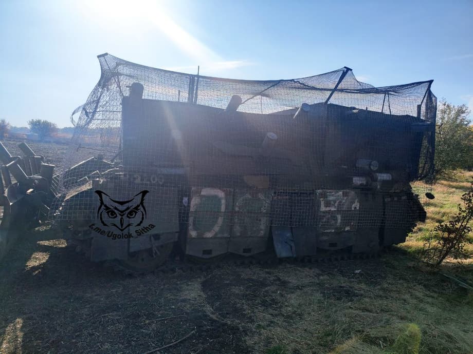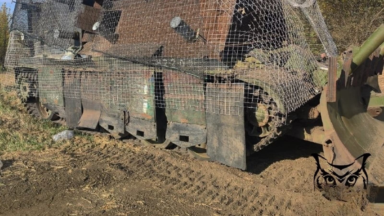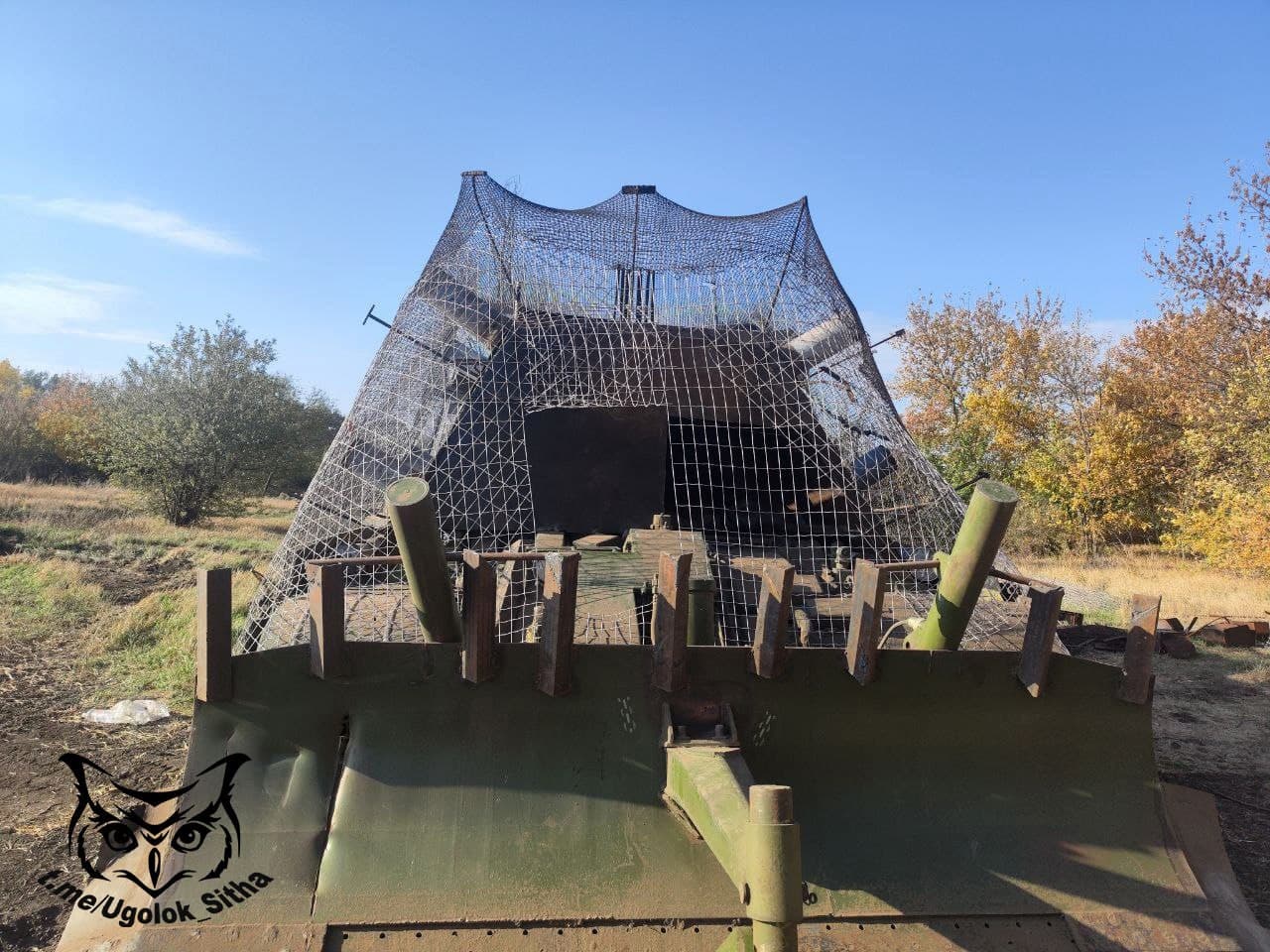 На корпус среднего танка Т-62, у которого, по всей видимости, демонтировали башню, установили «супер-мангал» — антидроновую сетку. Для еще большей защищенности от БПЛА-камикадзе поверх натянули дополнительный слой стальной сети.