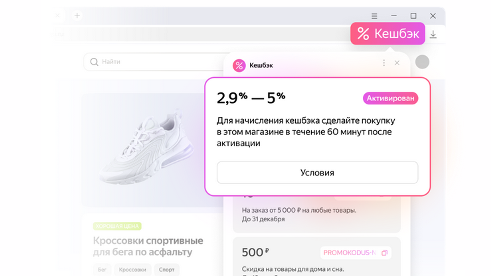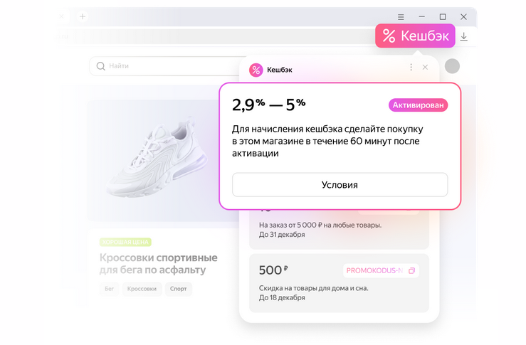 Покупайте через Браузер — и получайте кешбэк рублями. Если опция доступна, справа от адресной строки браузера появится кнопка «Кешбэк и промокоды». Нажмите её, добавьте товары в корзину и оформите заказ. Посмотреть доступную сумму и вывести деньги на карту можно в разделе «Кошелёк и карты».
