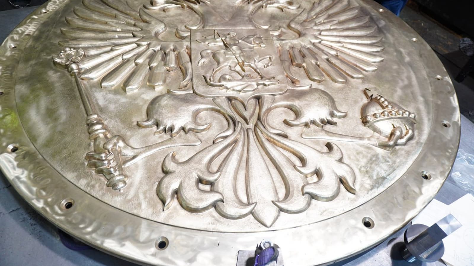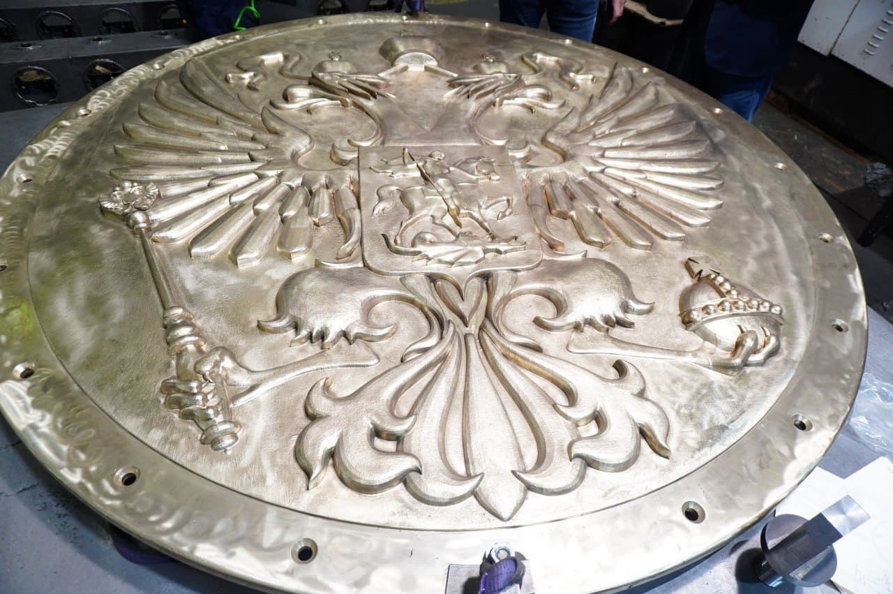 Военно-промышленный холдинг «Кингисеппский машиностроительный завод» (KMZ) изготовил 500-килограммовый щит с барельефом герба РФ для корабля Минобороны РФ. Об этом сообщила пресс-служба холдинга.