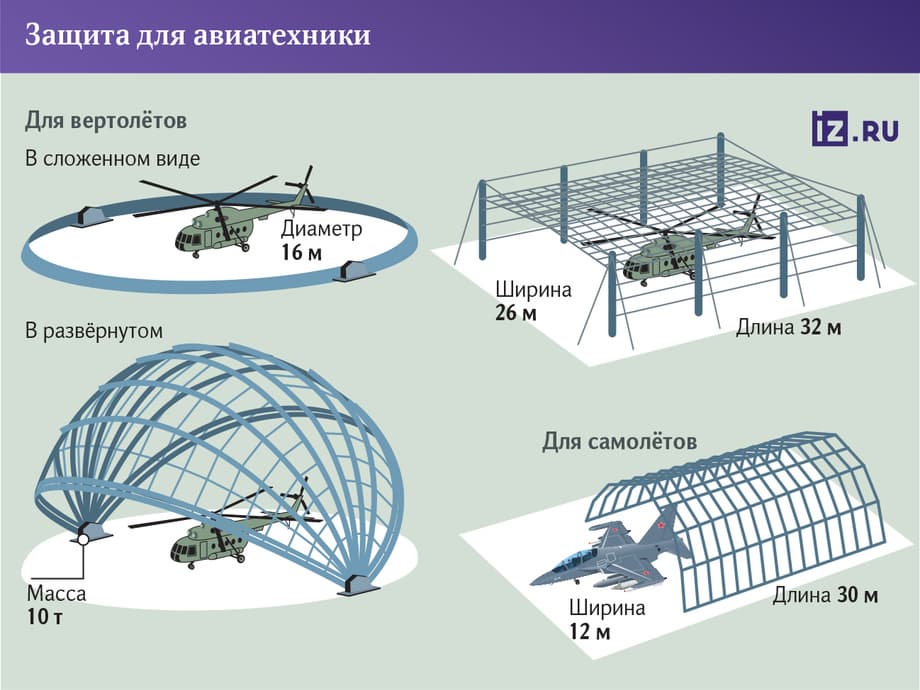 В России разработали противодроновые укрытия для вертолетов и самолетов. Они состоят из тросовых секций и стальных складывающихся арок, которые позволяют сдержать даже достаточно крупный ударный беспилотник.