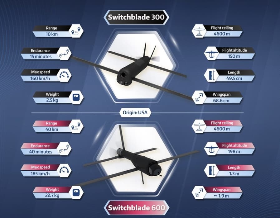 Он призвал избежать недооценки Switchblade-600, поскольку при сверхмалой эффективной отражающей поверхности порядка 0,01 - 0,02 м² радиус его действия эквивалентен штатной версии БПЛА-камикадзе «Ланцет» в модификации «Изделие 52» и составляет 40 - 45 км.