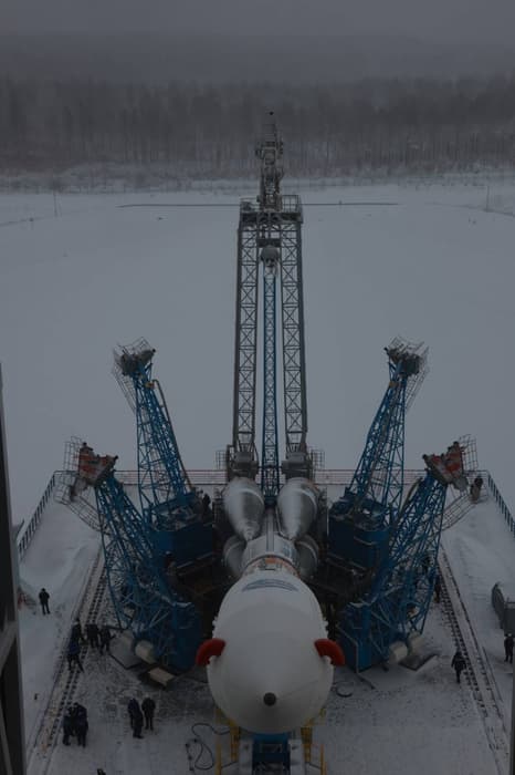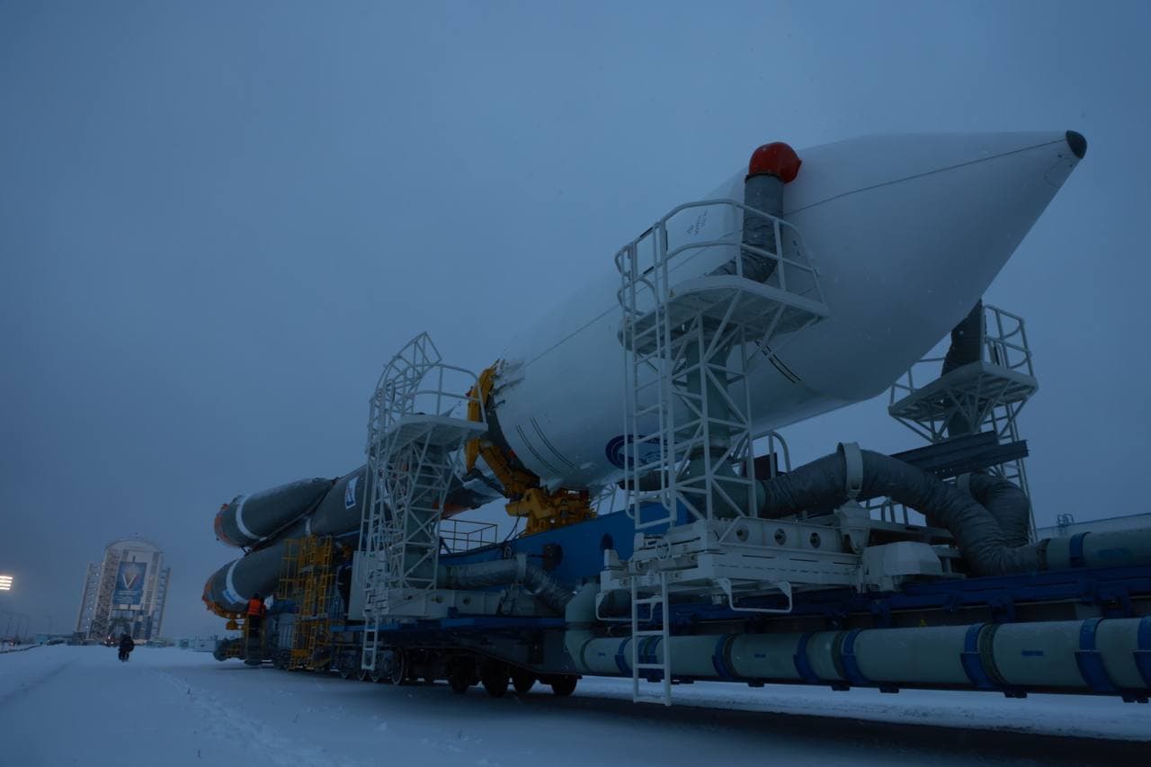 На космодроме Восточный вывезли и установили на стартовый комплекс ракету «Союз» с российским спутником «Кондор-ФКА» № 2.