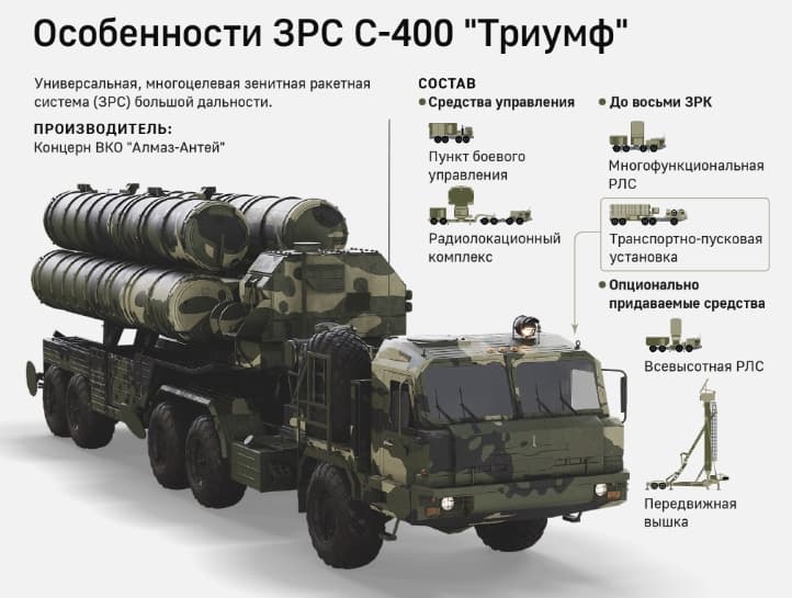 В состав С-400 «Триумф» входит пункт боевого управления, транспортно-пусковая установка, радиолокационный комплекс, радиолокационная станция и другие опциональные средства. Система способна поражать аэродинамические цели на высоте от 10 м до 30 км и расстоянии от 2,5 до 380 км.