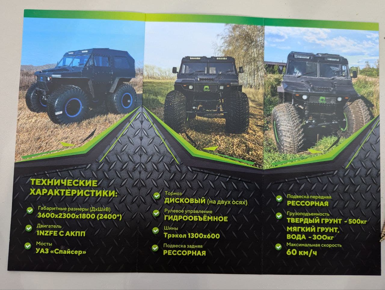 В линейке моделей «Тайпан» имеются как версии с открытым кузовом, так и с кабиной, вмещающей до 6 человек и предлагающей два полноценных спальных места. Это позволяет использовать вездеход для долгих экспедиций или командировок в условиях ограниченного пространства. Вездеход достигает максимальной скорости до 60 км/ч, что является оптимальным для таких экстремальных условий эксплуатации.