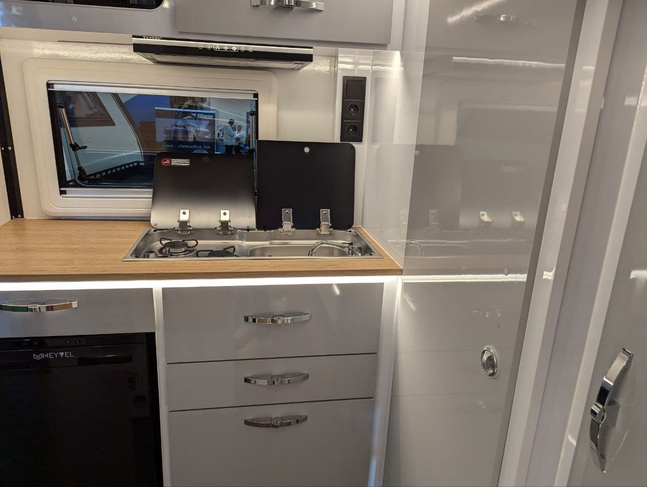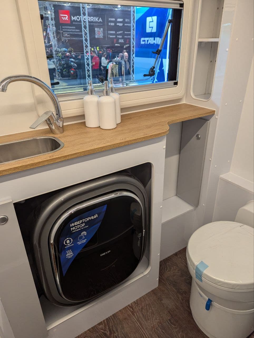 Внутри можно установить те же самые гриль, посудомоечную машину, стиральную машину, холодильник и другие привычные бытовые удобства, а также, например, добавить зарядку аккумуляторов от автомобиля в движении или настроить подогрев аккумуляторов.