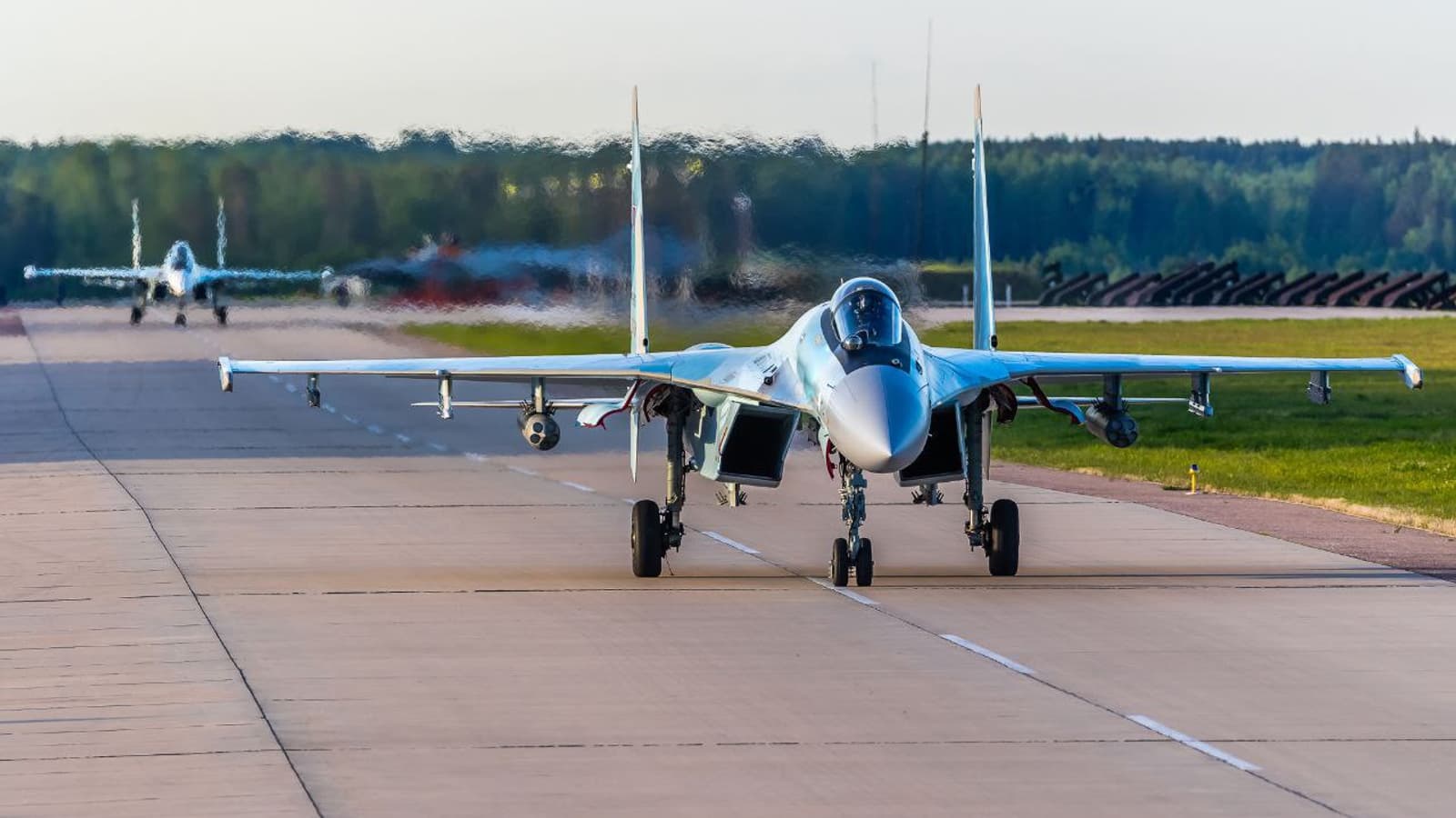 В Сети появился редкий кадр с многофункциональным истребителем Су-35С, оснащенного двумя блоками Б-13Л с неуправляемыми реактивными снарядами линейки С-13 «Тулумбас».
