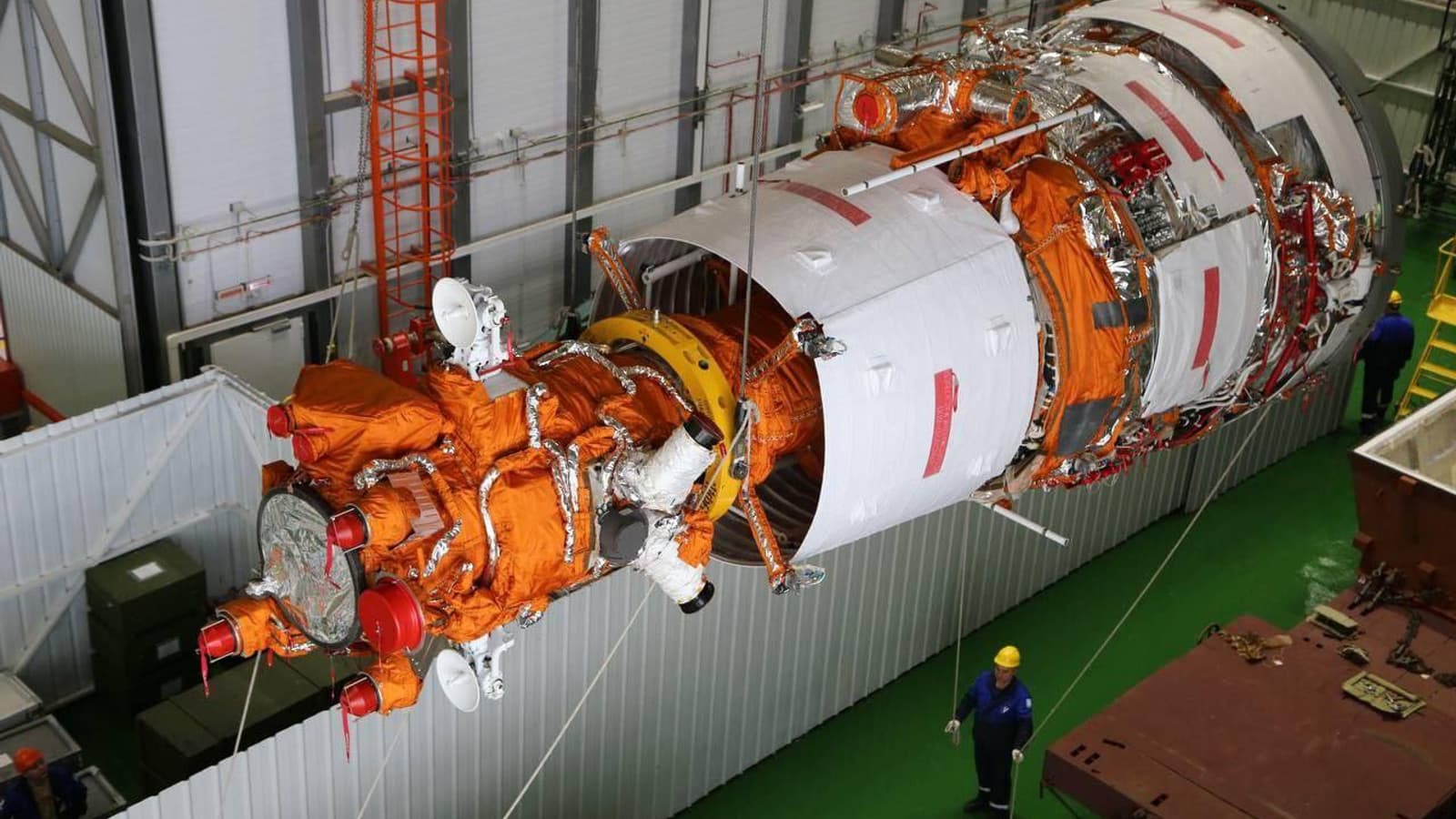 Аппарат выгрузили из контейнера и установили на испытательный стенд для подготовки к запуску.