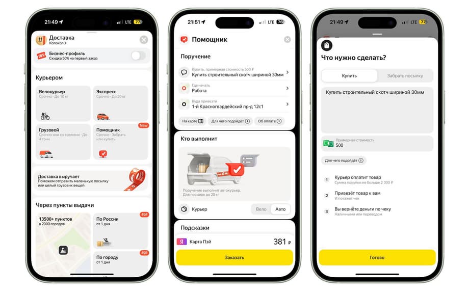 «Яндекс Доставка» запустила тестирование новой функции «Помощник». Теперь можно не только заказать доставку товаров, но и попросить курьера, например, забрать покупку из пункта выдачи, сделать небольшую покупку, захватить куртку из химчистки или лекарство из аптеки.
