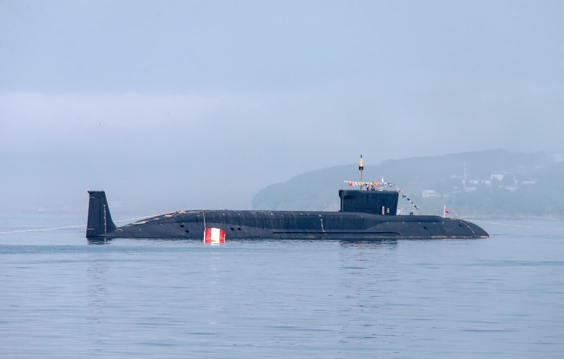 Атомный ракетный подводный крейсер стратегического назначения «Князь Пожарский» проекта 955А (шифр «Борей-А») отрабатывает программу ходовых испытаний в море. Его впервые вывели из эллинга в 2024 году для морских испытаний.