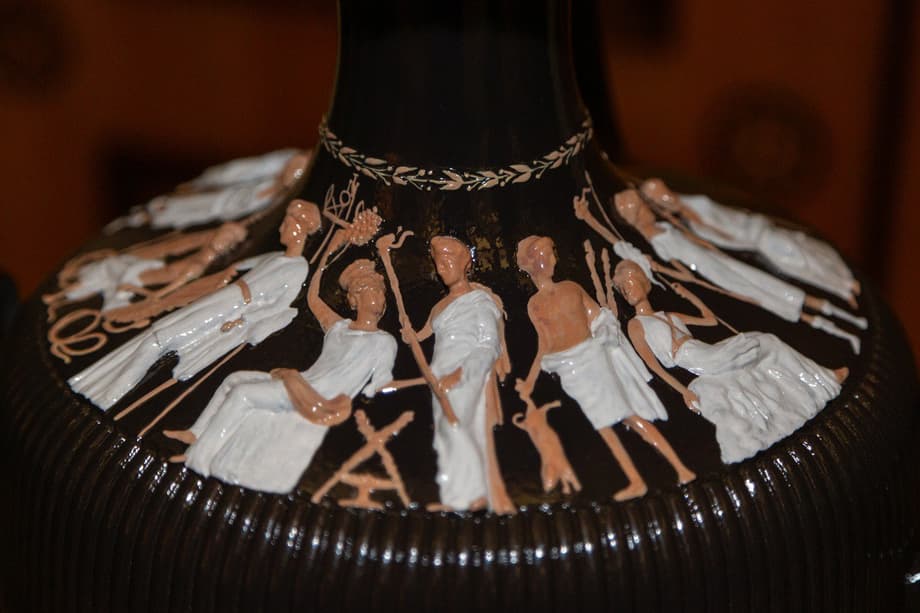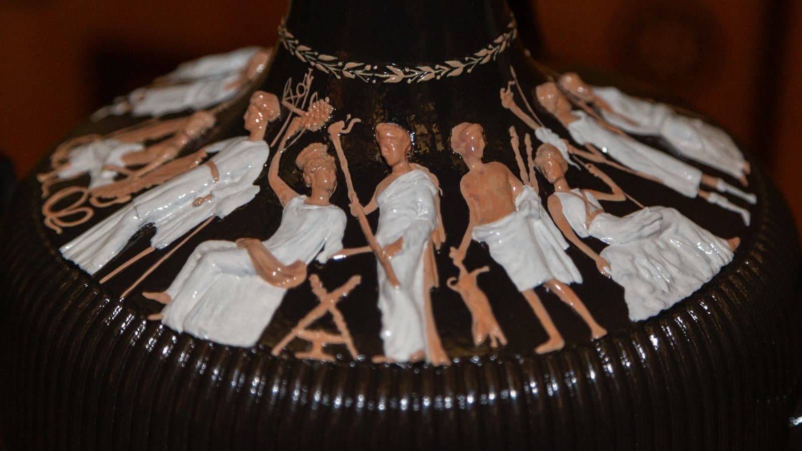 Копия представляет собой чернолаковую гидрию IV века до нашей эры, известную, как «Царица ваз». Она была изготовлена с высокой точностью, воспроизводены не только рельеф, но и форма,, а также цветовые особенности оригинала. Процесс создания макета включал цифровое моделирование и 3D-печать, после чего она была дополнительно обработана и расписана вручную.