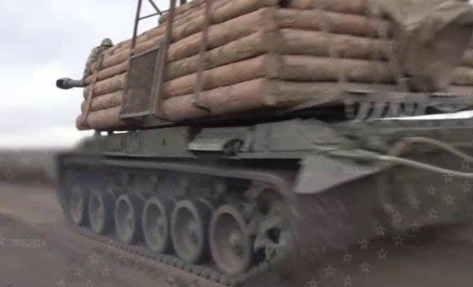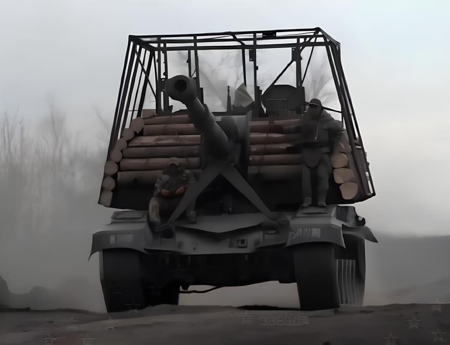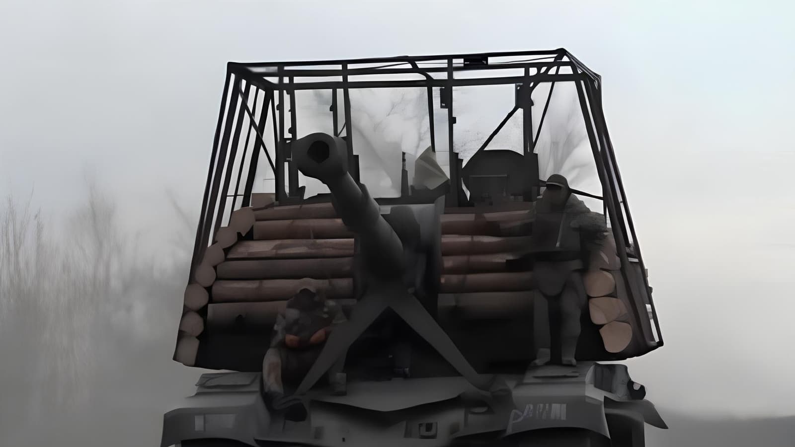 В Сети появились кадры боевой самоходки «Мста-С», оснащенной развитым импровизированным противокумулятивным бревенчатым комплектом защиты.
