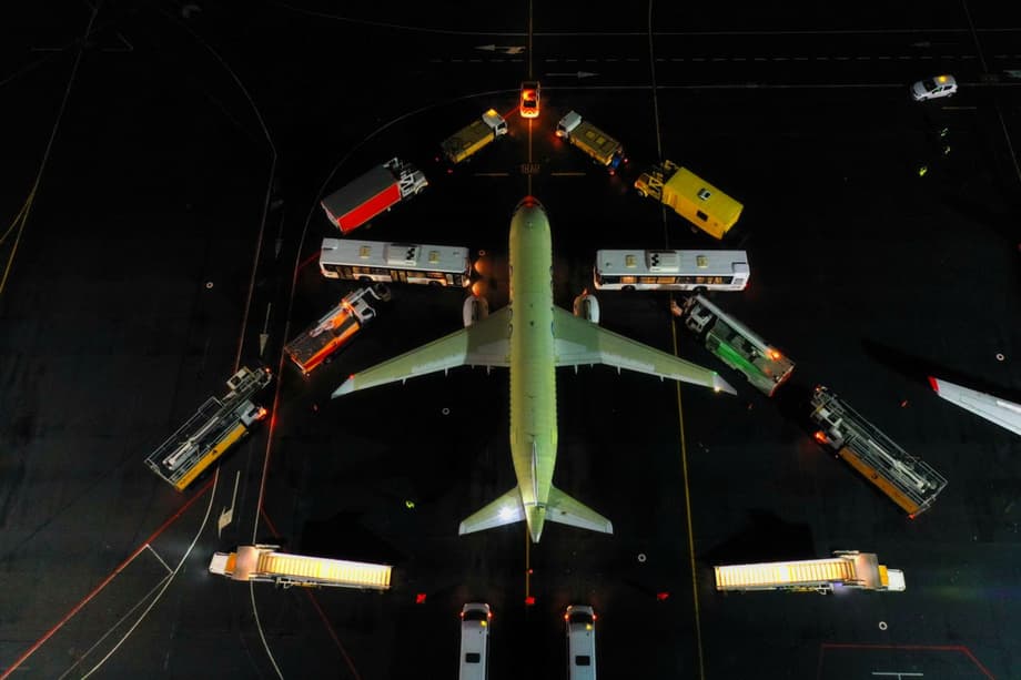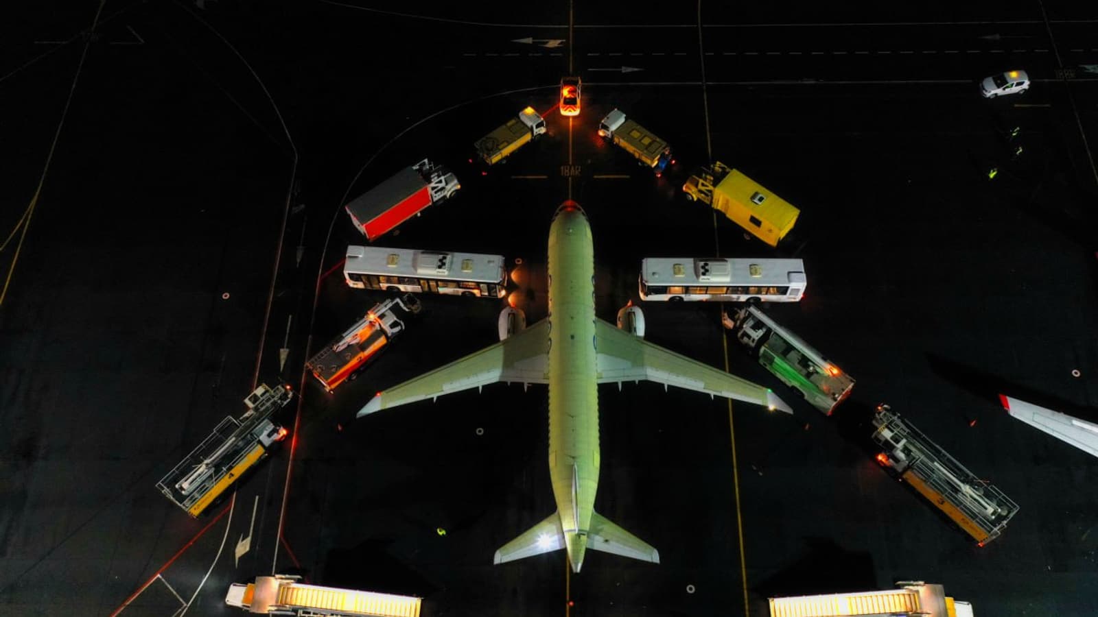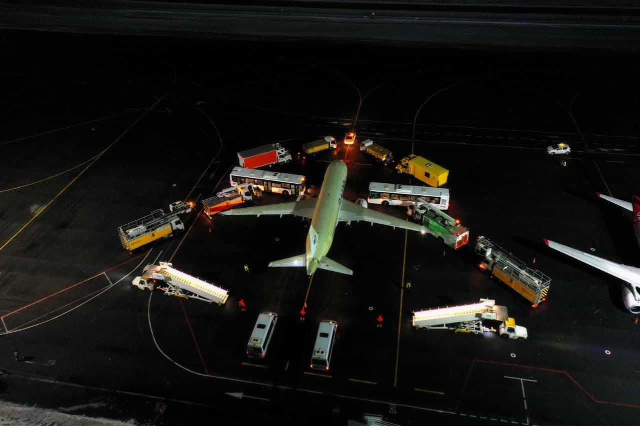 Техника аэропорта выстроилась на взлетно-посадочной полосе вокруг лайнера, словно новогодняя ёлка, и зажгла фары, словно новогодние гирлянды.