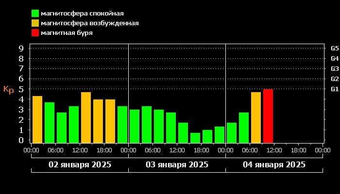 По его данным, магнитные возмущения начали ощущаться утром, и индекс Кр, который измеряет уровень геомагнитных изменений, достиг отметки в пять единиц. В течение дня геомагнитное поле останется слабо возмущённым, с периодами слабых магнитных бурь.