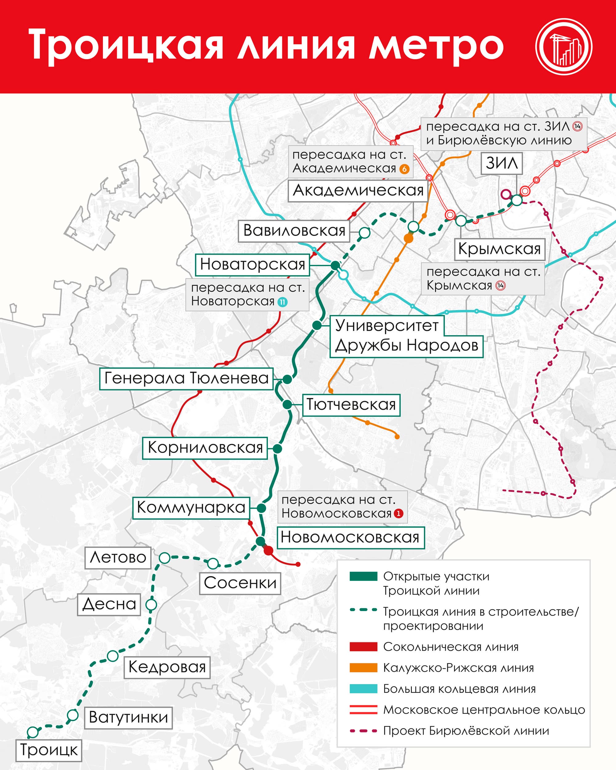 Он напомнил, что в прошлом году в Москве открыли восемь новых станций метро. В 2025 году планируется завершить строительство участка Троицкой линии от «ЗИЛ» до «Новаторской». А к 2030 году на этой линии появятся станции «Сосенки», «Летово», «Десна», «Кедровая», «Ватутинки» и «Троицк».