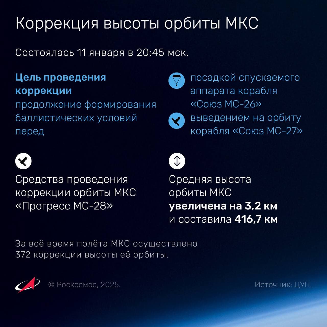 Проведена коррекция высоты орбиты МКС. Мы продолжаем готовиться к старту нового пилотируемого корабля «Союз МС-27» и посадке «Союза МС-26»