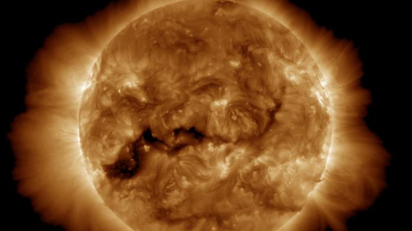 На Солнце открылась корональная дыра, охватывающая 1/4 его окружности. Ультрафиолетовые камеры NASA показывают её как массивное темное пятно в атмосфере звезды.