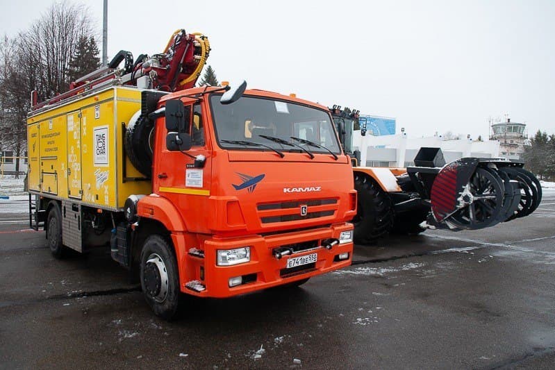 Среди транспортных средств в аэропорту появился современный деайсер — машина, предназначенная для удаления льда, оснащённая поднимающейся кабиной. Она позволяет обрабатывать самолёты в сложных погодных условиях, обеспечивая безопасность полётов. Деайсер создан на базе КамАЗа.