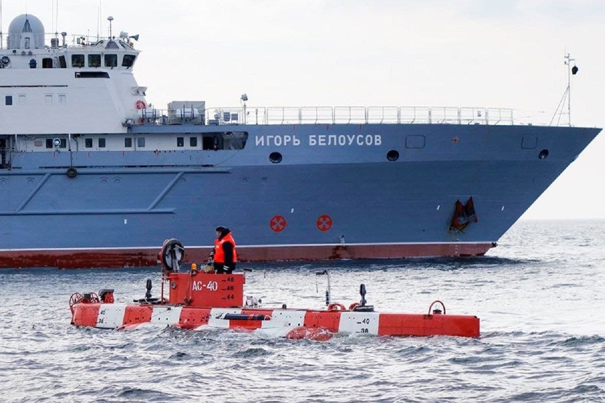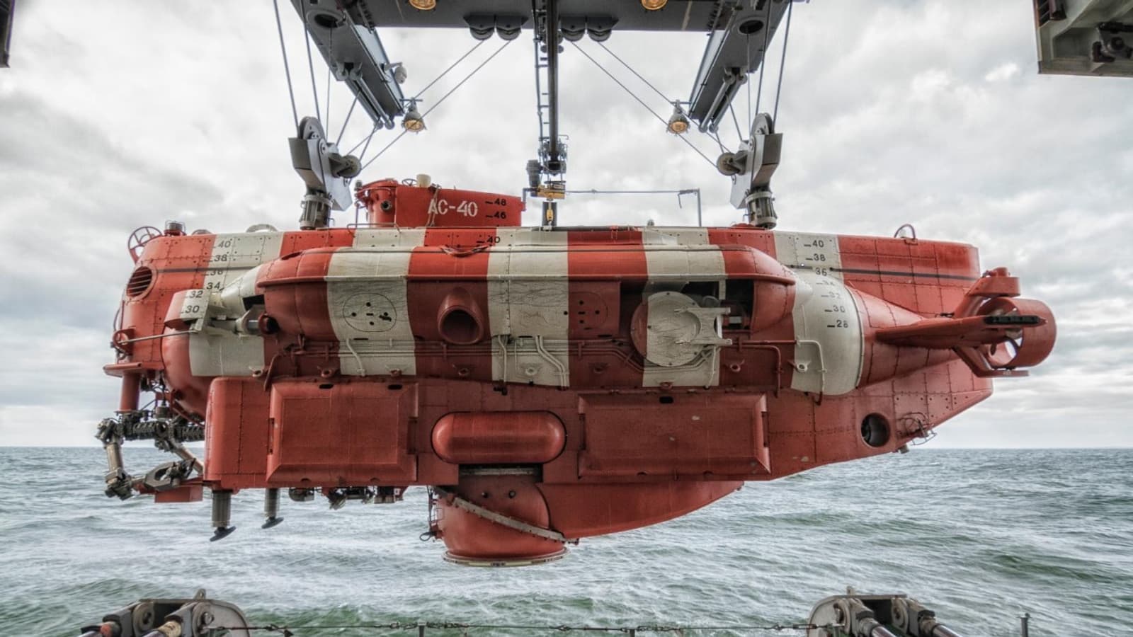 Глубоководный аппарат спустили на воду с борта спасательного судна «Игорь Белоусов». На глубине 60 метров экипаж «АС-40» искал стенд-макет, имитирующий субмарину.