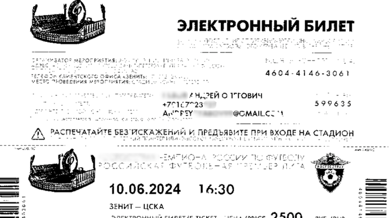 Электронные письма от FakeTicketer содержат вложение в виде архива, имя которого дублирует тему письма. Вложенный архив содержит исполняемый файл с аналогичным именем, связанным с легендой атаки. В качестве документа-приманки FakeTicketer использовал фальшивые билеты на спортивные мероприятия: например, на матчи футбольной премьер-лиги России, соревнования по водной гребле на байдарках и каноэ.