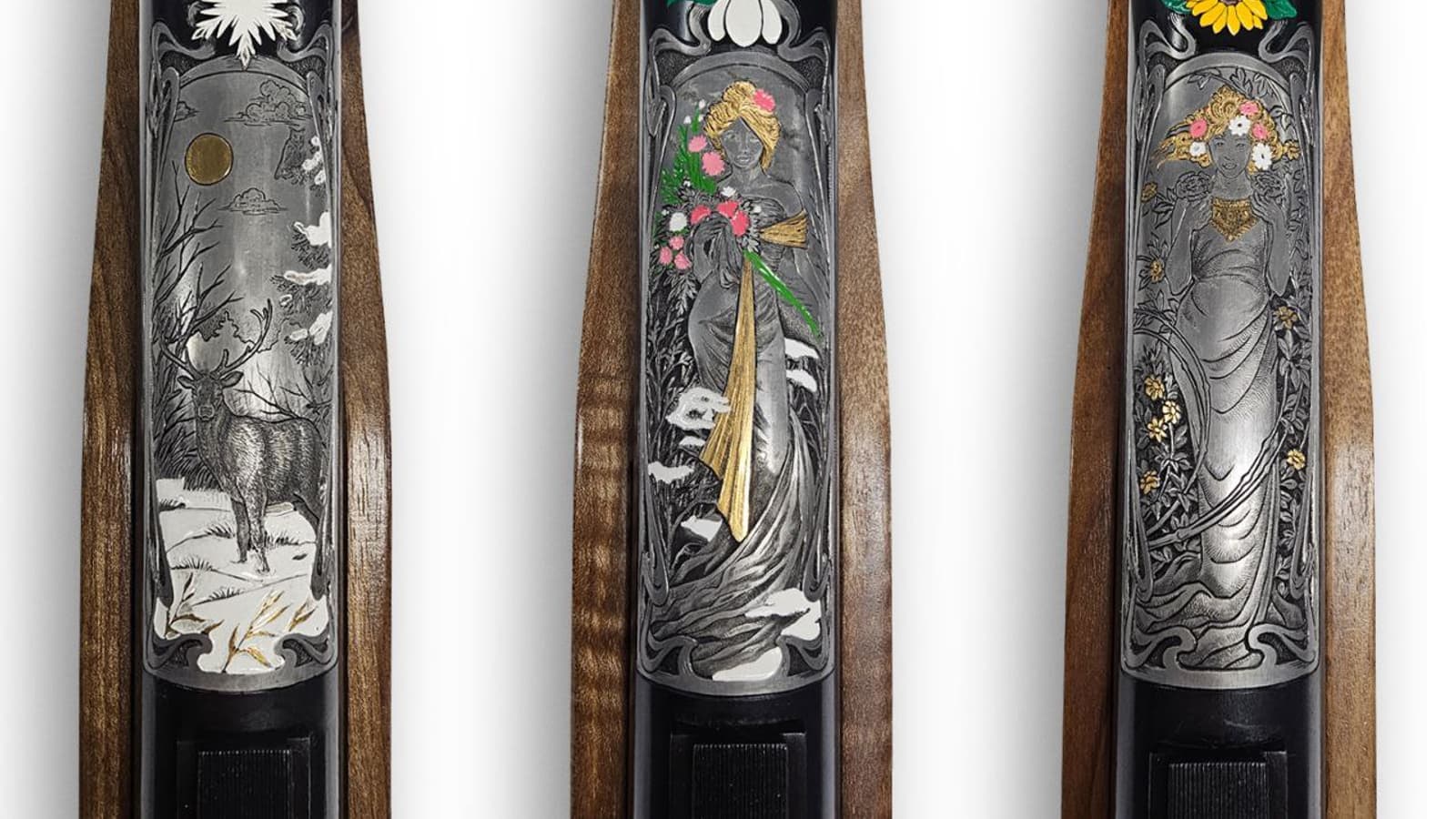 На каждой из винтовок, олицетворяющих месяц, нанесены свои уникальные изображения людей, животных, птиц, природы, все они выполнены в единственном экземпляре. Изображения выполнены в технике обронной гравировки с применением драгоценных металлов и цветной эмали.