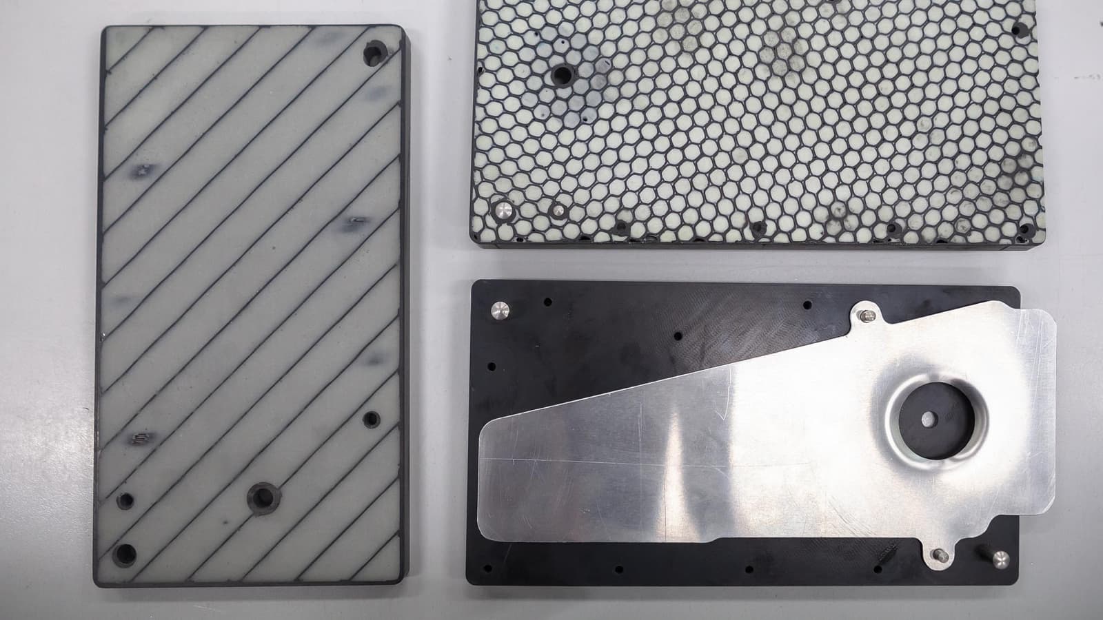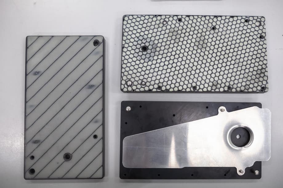 Для заливки используем реактопласты – пластмассы, способные затвердевать, подобно бетону. Экспериментируя с технологией заливки и специальными наполнителями для оснастки, мы испытали стеклянный и графитовый порошок, алюминиевую пудру. Задача заключалась в том, чтобы найти оптимальный состав, благодаря которому при больших нагрузках форма будет меньше деформироваться. Результат показал, что напечатанная пластиковая форма отлично переносит рабочие нагрузки прессом. По предложенной нами технологии оснастка производится в более короткие сроки и имеет более низкую себестоимость.