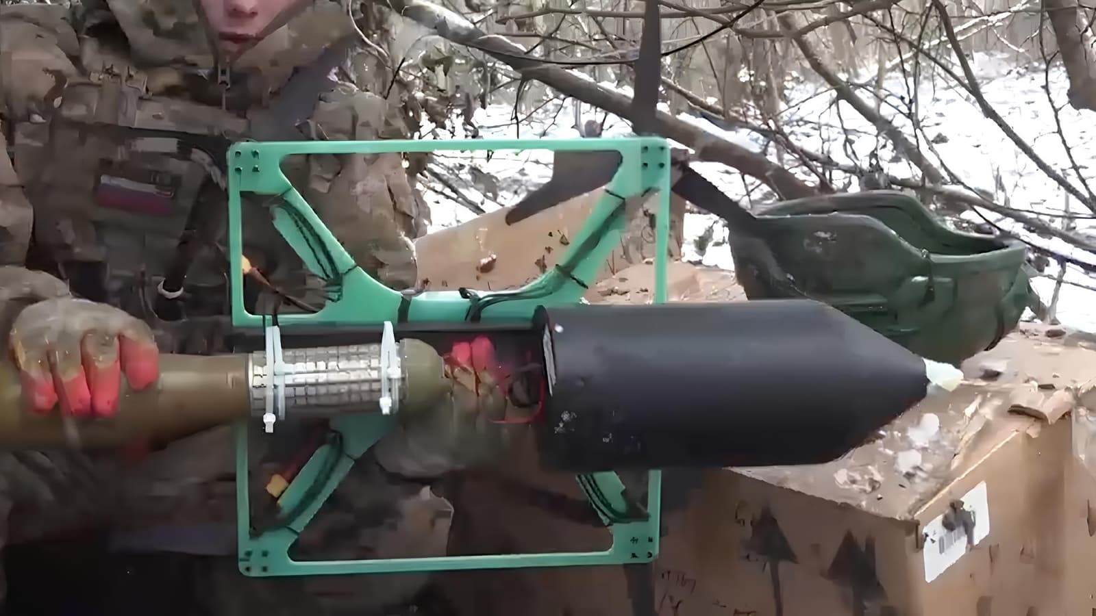 На видео можно заметить, что дрон оснащён кумулятивно-осколочной боевой частью,а именно гранатой ПГ-9 от станкового гранатомёта СПГ-9 «Копьё». Поражающий эффект боеприпаса дополнительно усилили осколками.