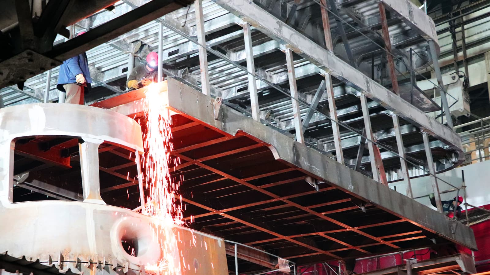 В судомонтажном цехе завода «Красное Сормово» закончили установку шестого блока на теплоход проекта 00840 «Карелия». Речь идёт о корме — самой большой по размеру части судна.