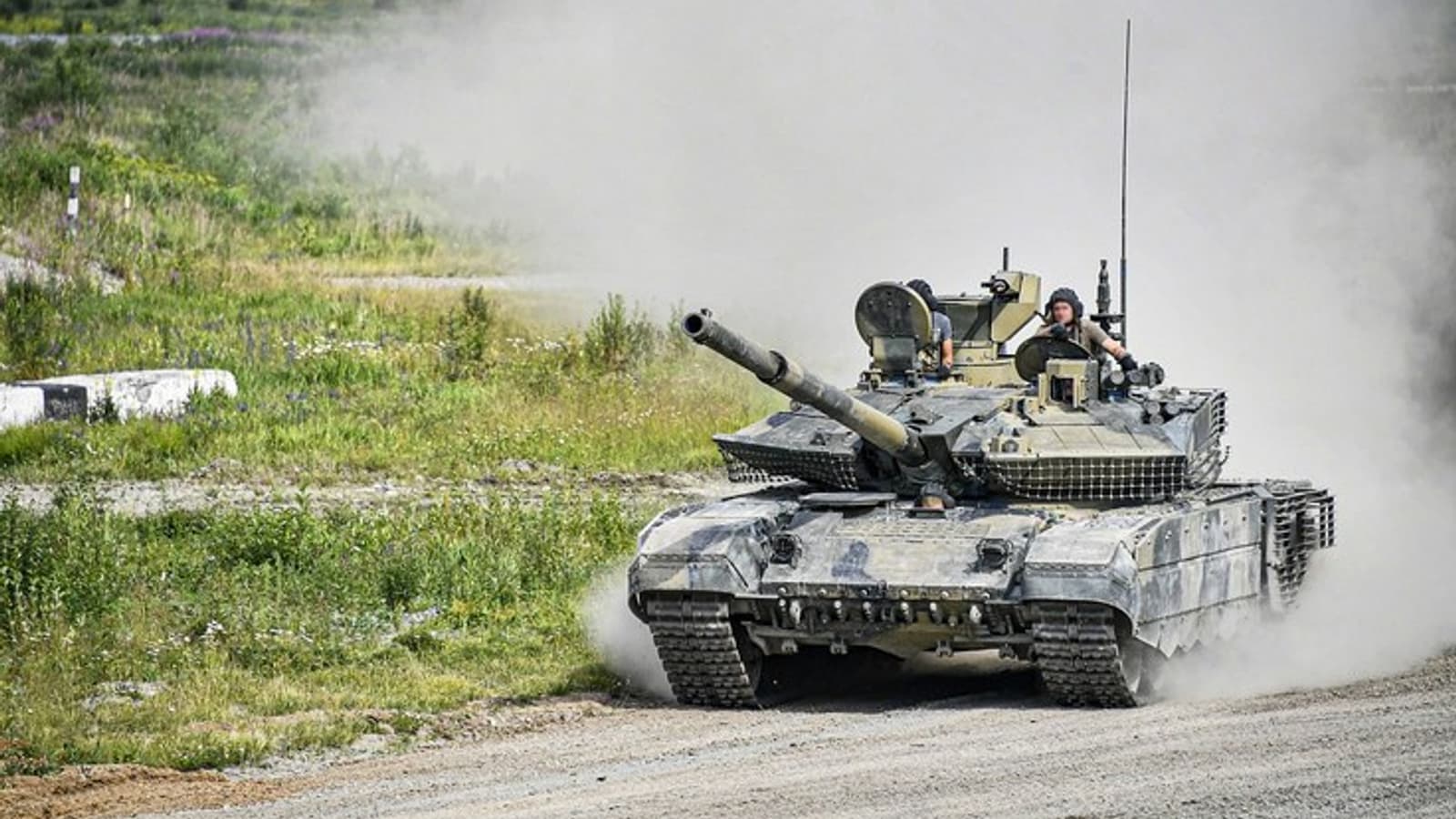 В Сети появились кадры российского основного танка Т-90М «Прорыв» с развитым противокумулятивно-противодронным «козырьком» и зигзагообразными рифлёными разнесёнными бронелистами в верхней полусфере.