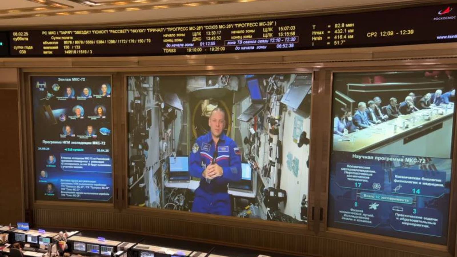 Роскосмос поделился кадрами из Центра управления полетами в Королеве - на них видно, как космонавт представляет комиссии свою научную работу.