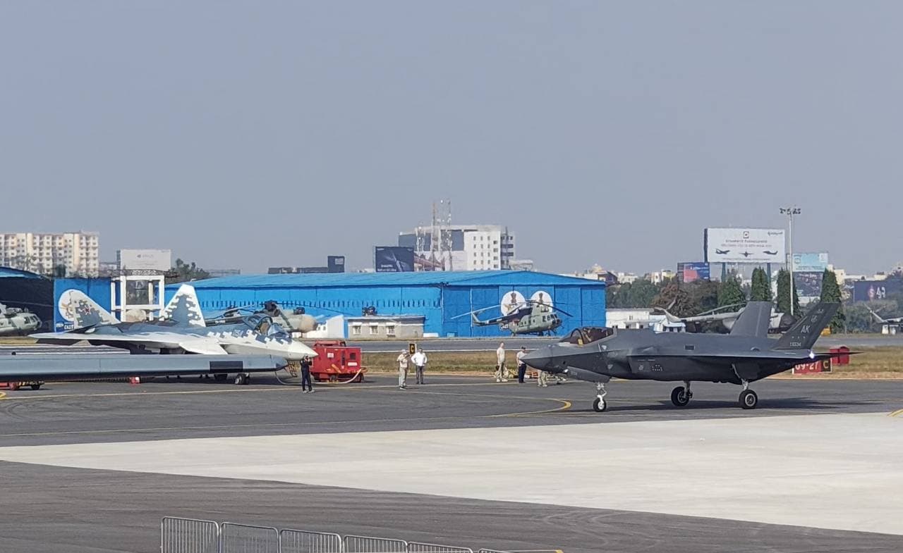 Российский многоцелевой истребитель пятого поколения Су-57Э оказался в нескольких десятках метров от истребителя пятого поколения F-35 Lightning II производства США на международном авиасалоне Aero India 2025. Кадры появились в Сети.
